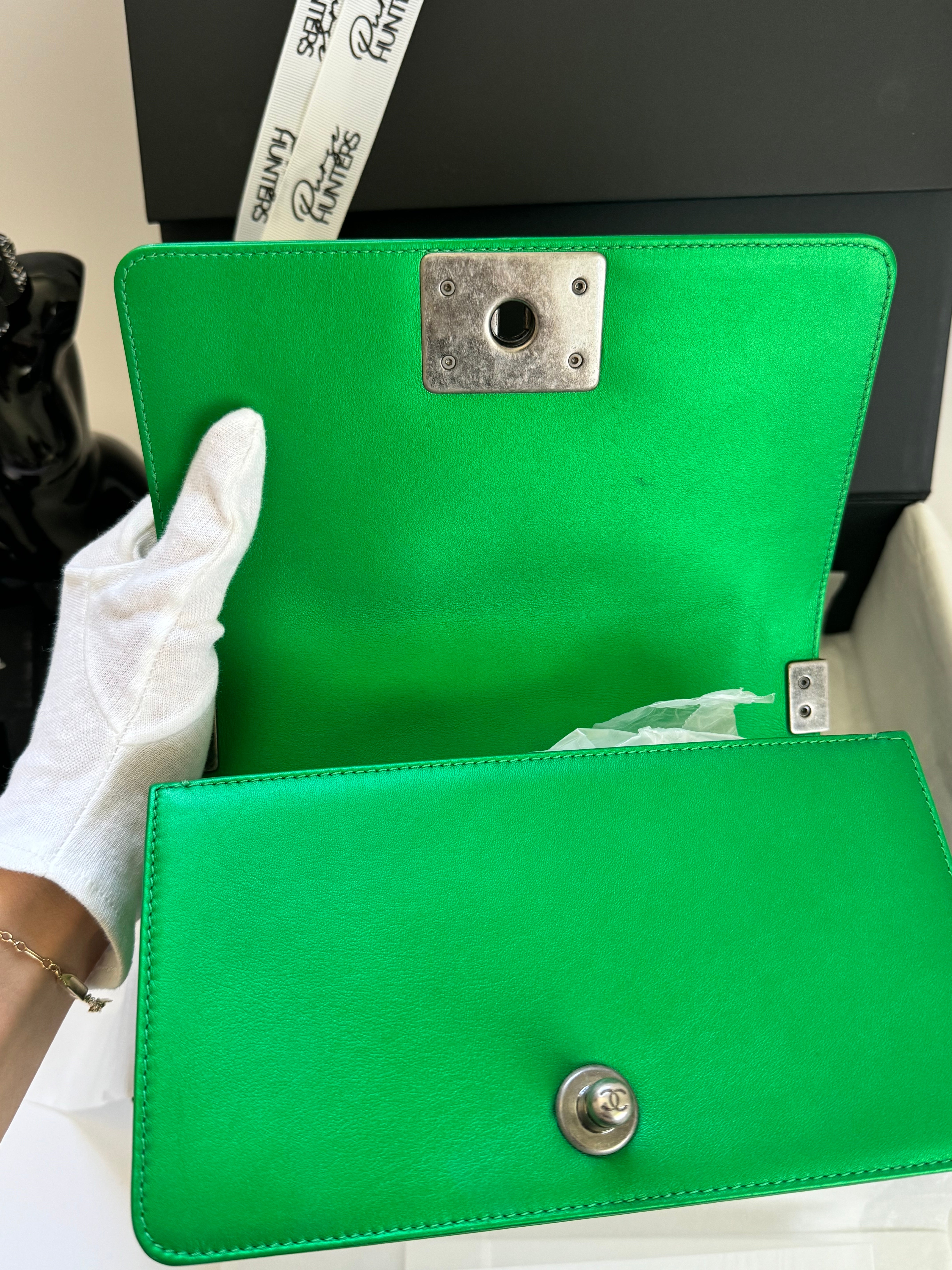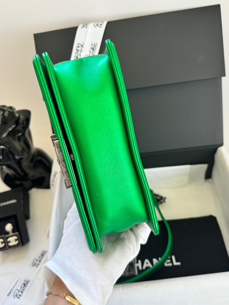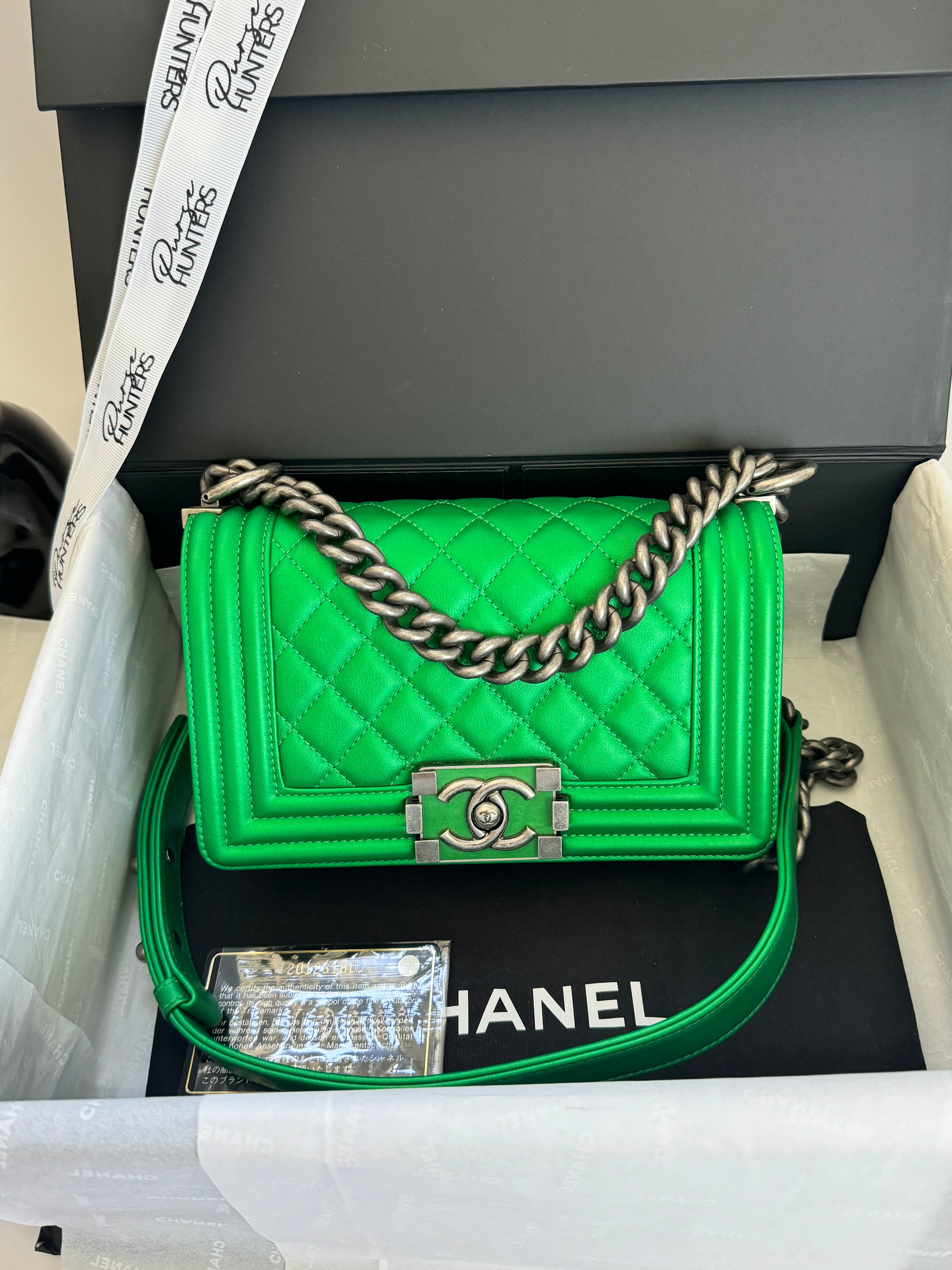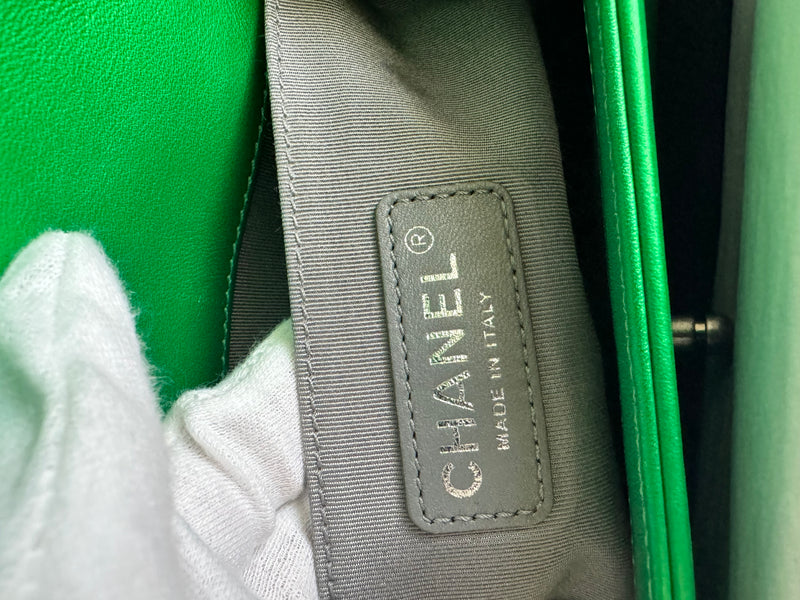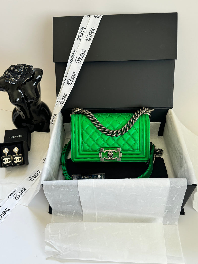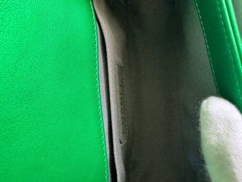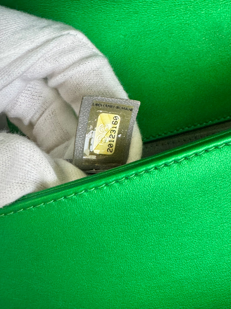Crafted in green leather with iconic gunmetal hardware, this beauty is the definition of bold meets timeless. The interlocking CC logo, quilted finish, and chain-link accents are all the signature details we love — straight from the era of Karl himself.