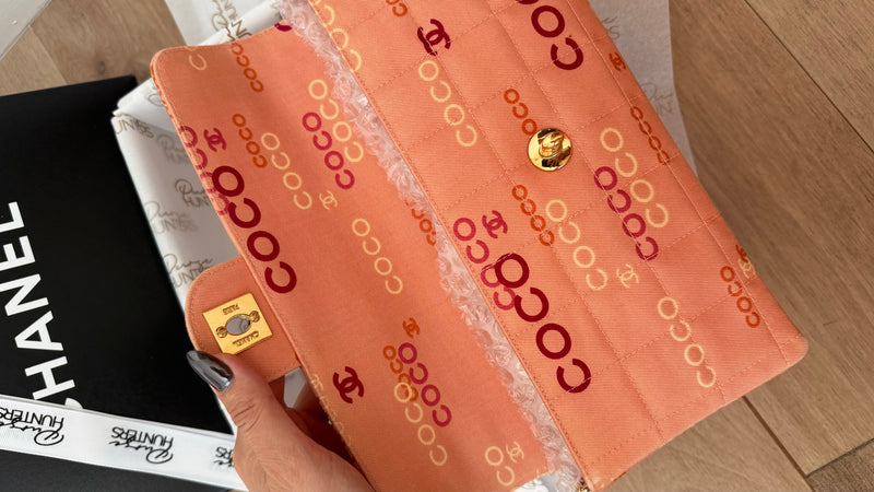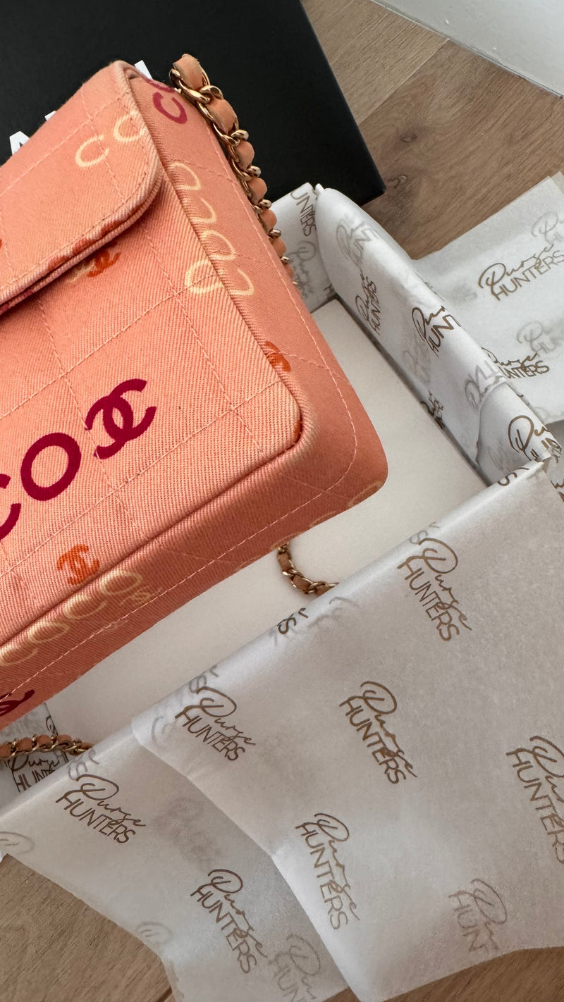 Rare Vintage Pink Canvas Chocolate Bar Flap Bag with 24k Gold Plated Hardware. Pink Leather interior. Corners are lightly faded from age. Can be worn as a clutch.