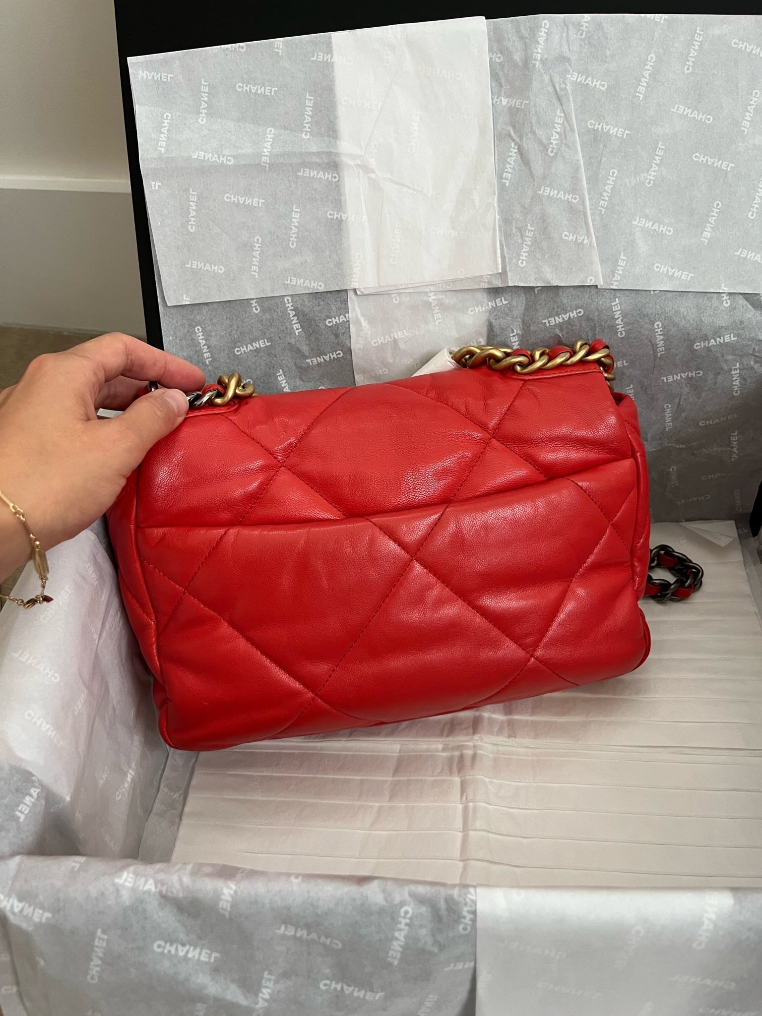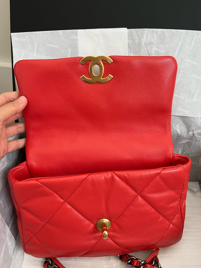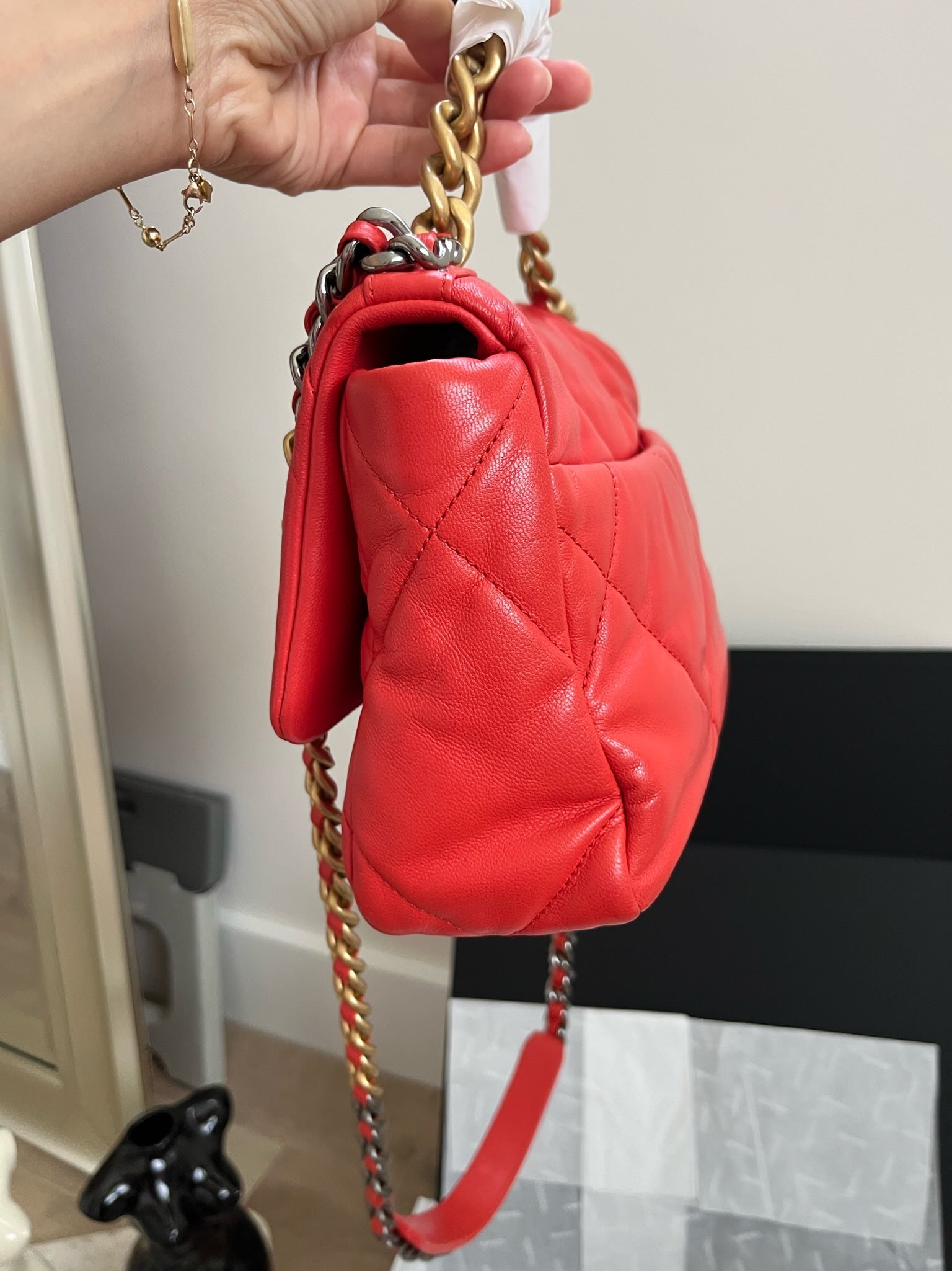This  100% authentic previously owned Large 19 Flap bag is of coral/orange lambskin with mixed metal hardware and has the signature diamond quilting, signature CC interlocking closure, exterior back pocket, chain top handle, and long mixed metal and white leather chain. In excellent condition. Comes with box, dust bag and card.