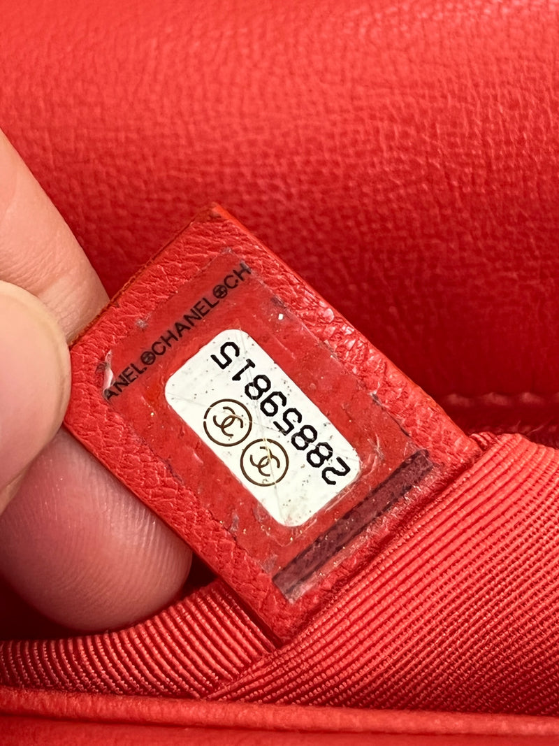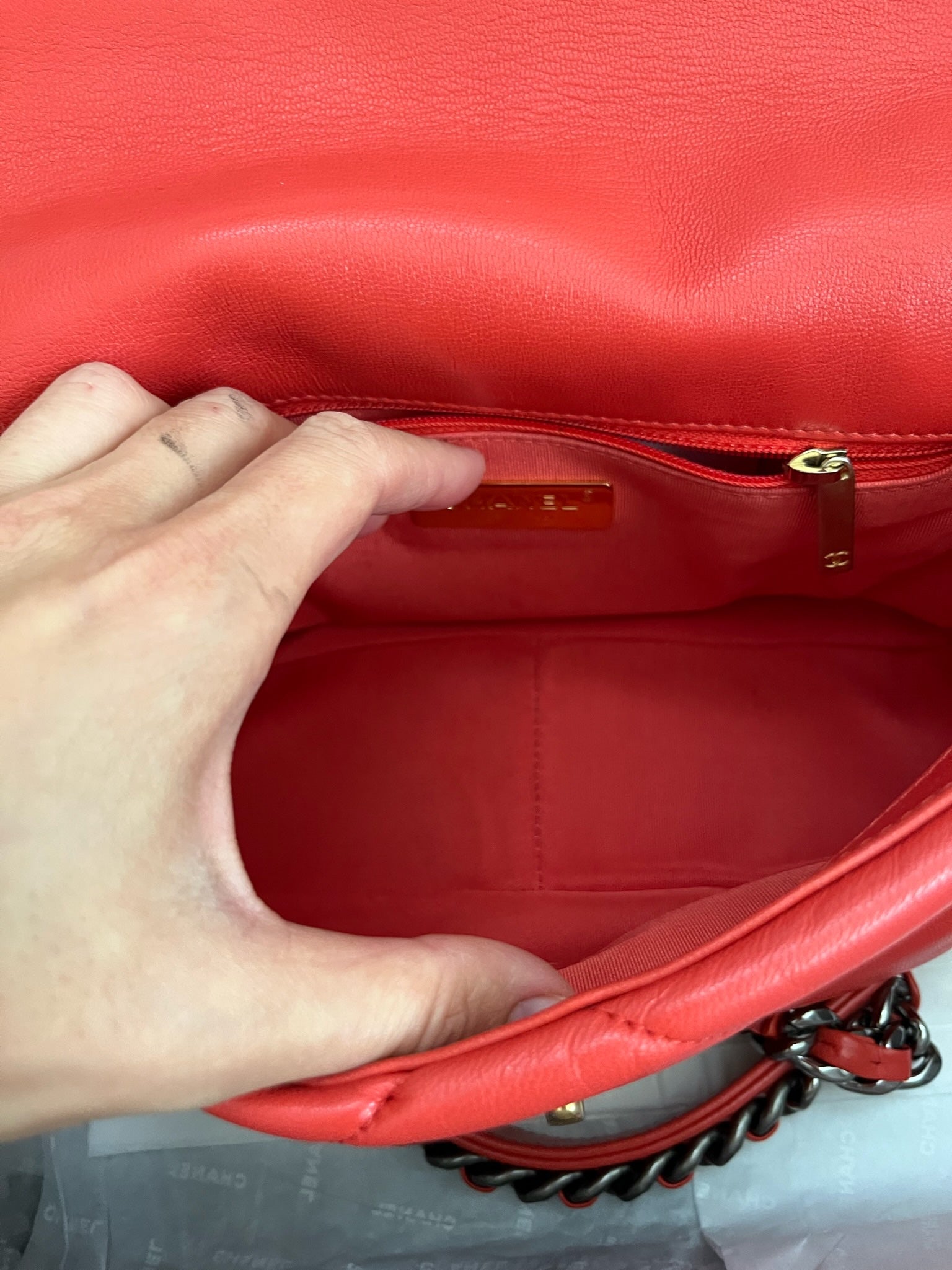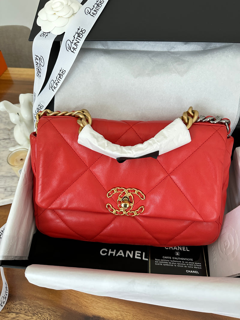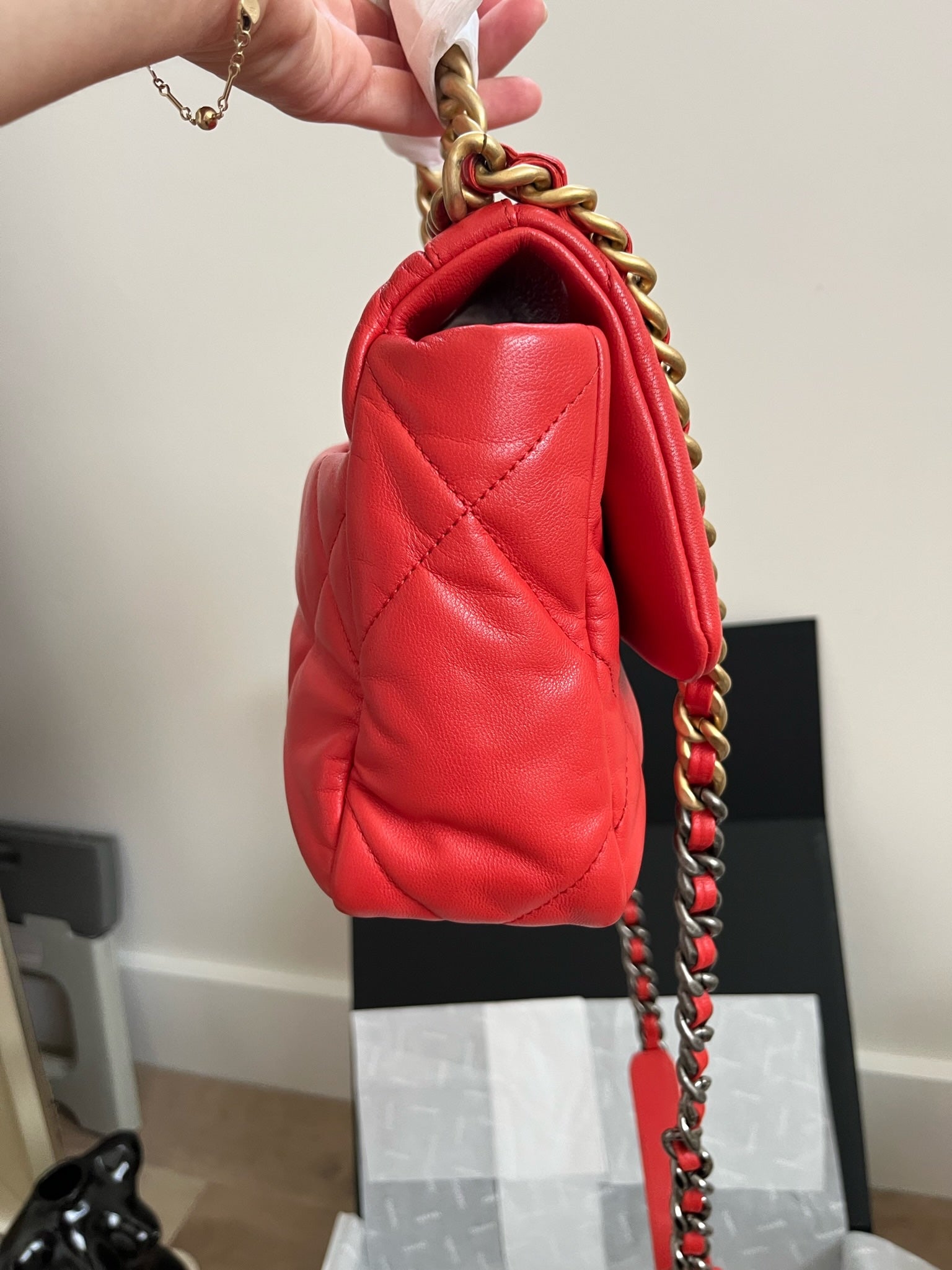 This  100% authentic previously owned Large 19 Flap bag is of coral/orange lambskin with mixed metal hardware and has the signature diamond quilting, signature CC interlocking closure, exterior back pocket, chain top handle, and long mixed metal and white leather chain. In excellent condition. Comes with box, dust bag and card.