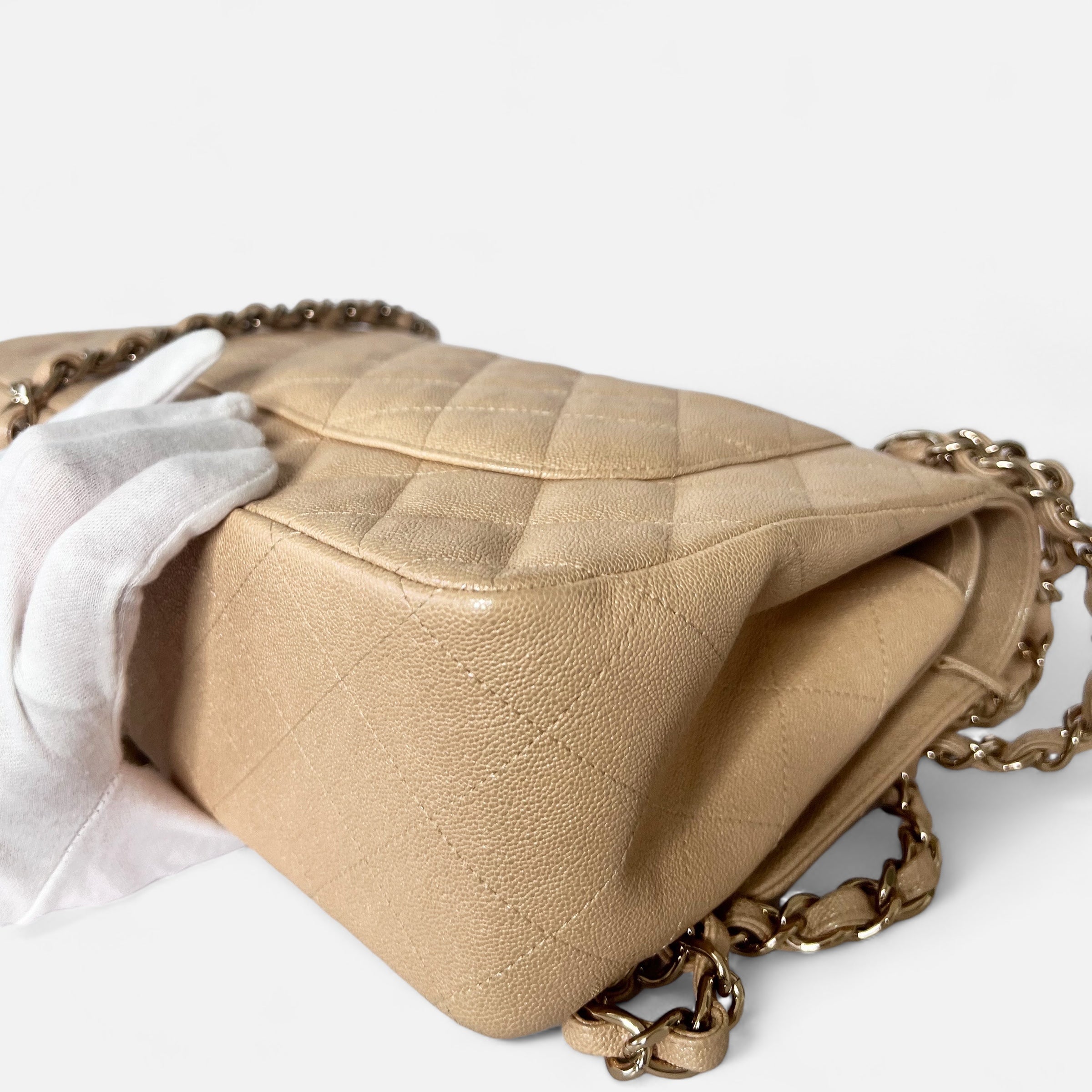 This is an 100% authentic Jumbo Double Flap in Beige. This bag is crafted of diamond quilted caviar leather in beige. This features a leather threaded chain-link shoulder strap with polished gold hardware. The Chanel CC turn-lock opens to an inner flap and matching leather interior with patch pockets.