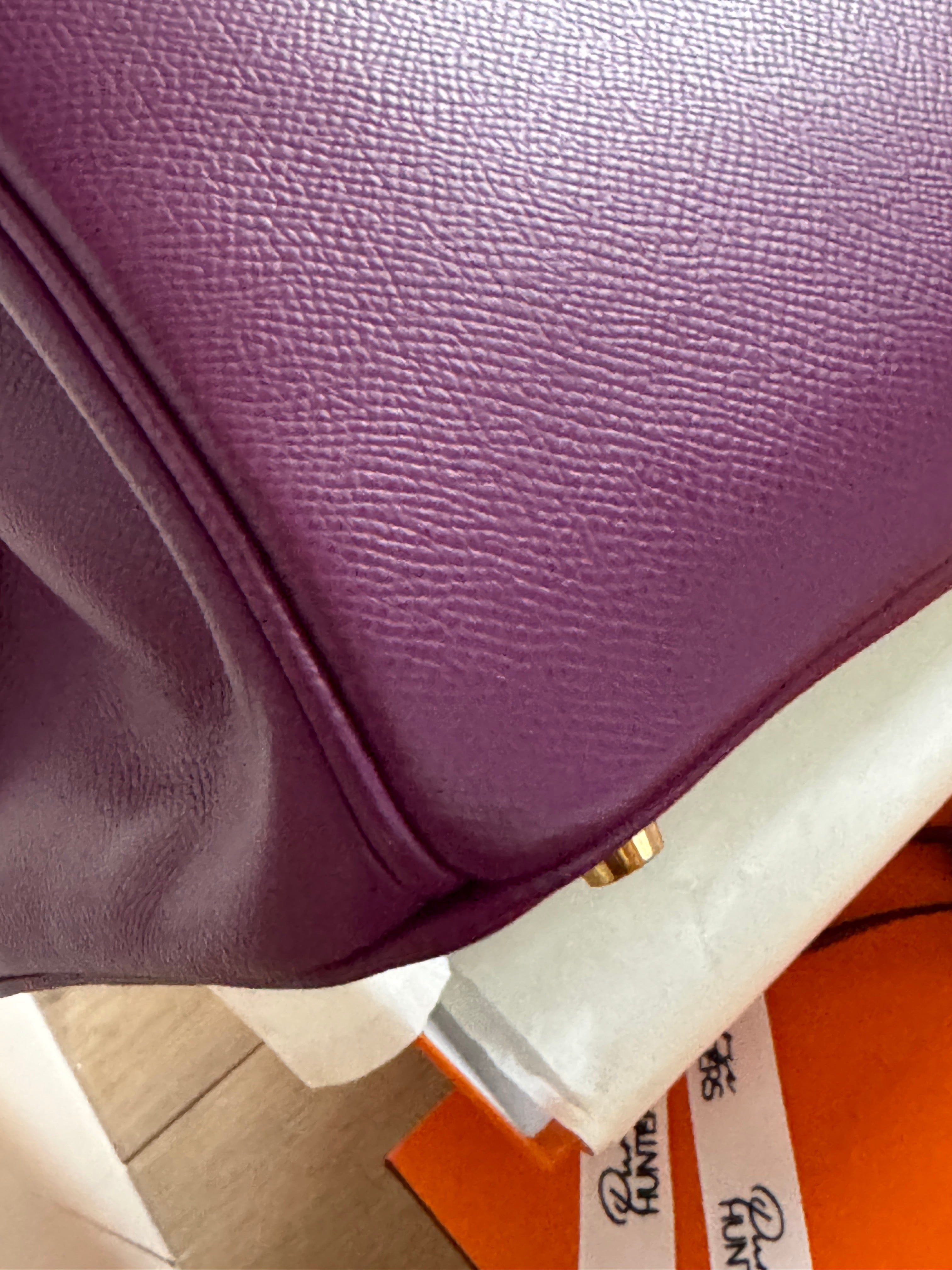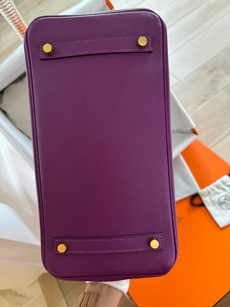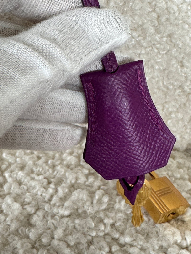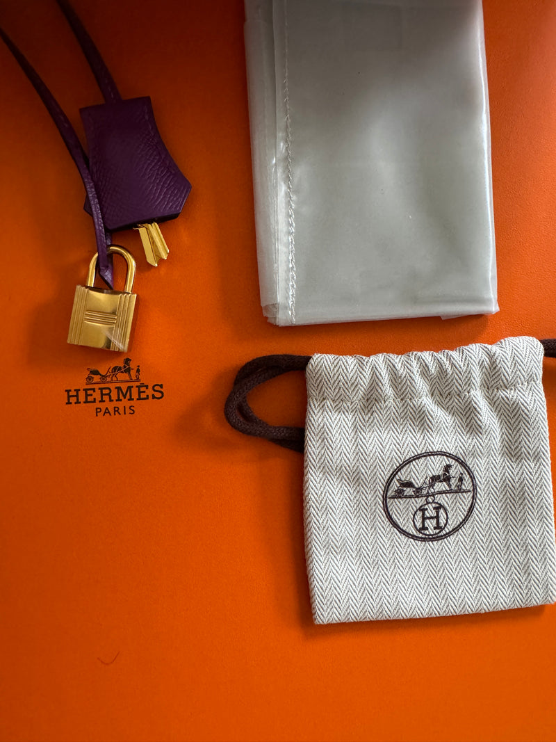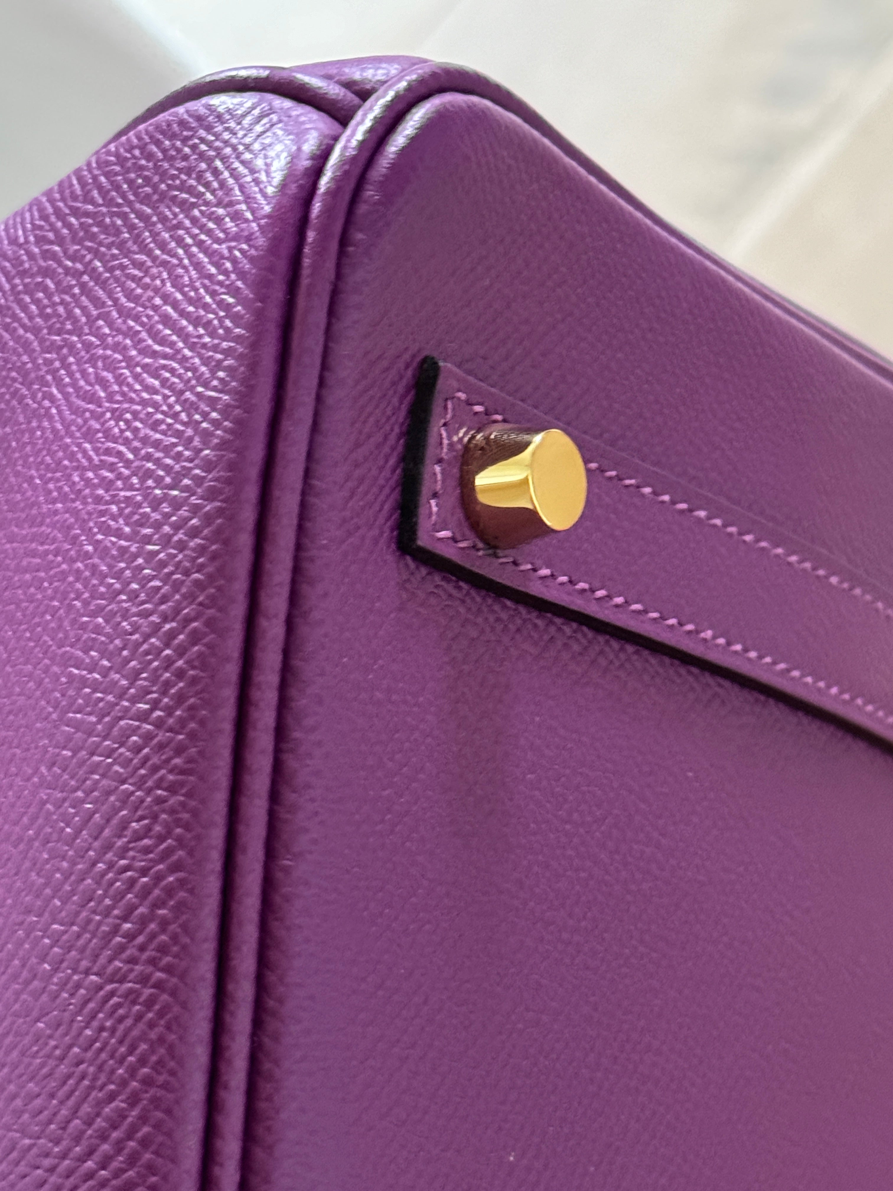 This ultra-chic classic handbag is crafted of luxurious epsom leather in beautiful purple Hermes Anemony color. The bag features thin but sturdy rolled leather top handles, a cross over flap with a strap closure, clasps with a gold plated turn lock with a matching padlock, and a hanging clochette with keys. The top opens to a spacious interior with zipper and patch pockets. Kept unused , flawless condition. With all plastics on hardware pieces, incl feet. This beautiful bag comes with dust bag, box, hardware set, rain coat, certificate of authenticity from Bababebi.
