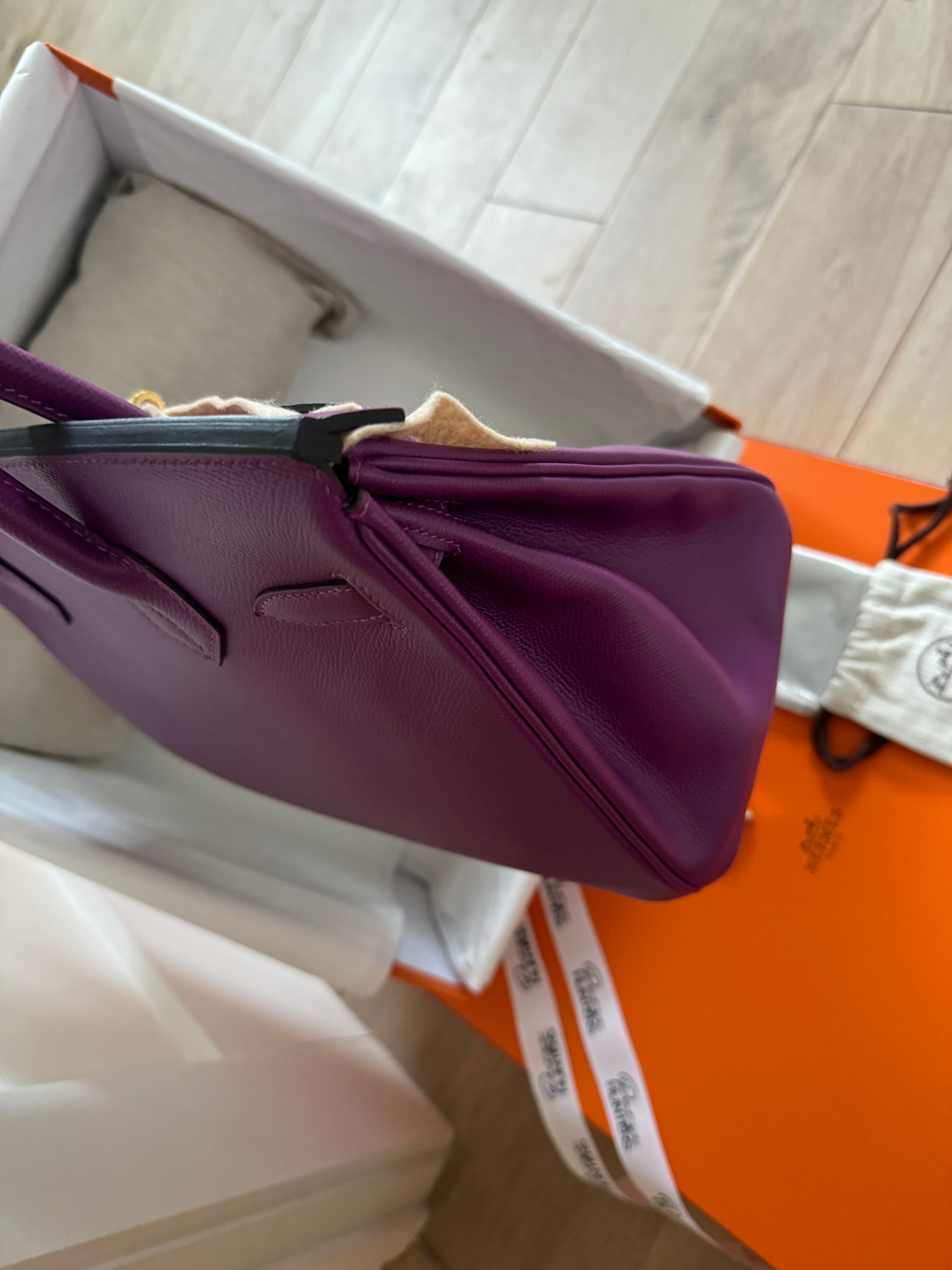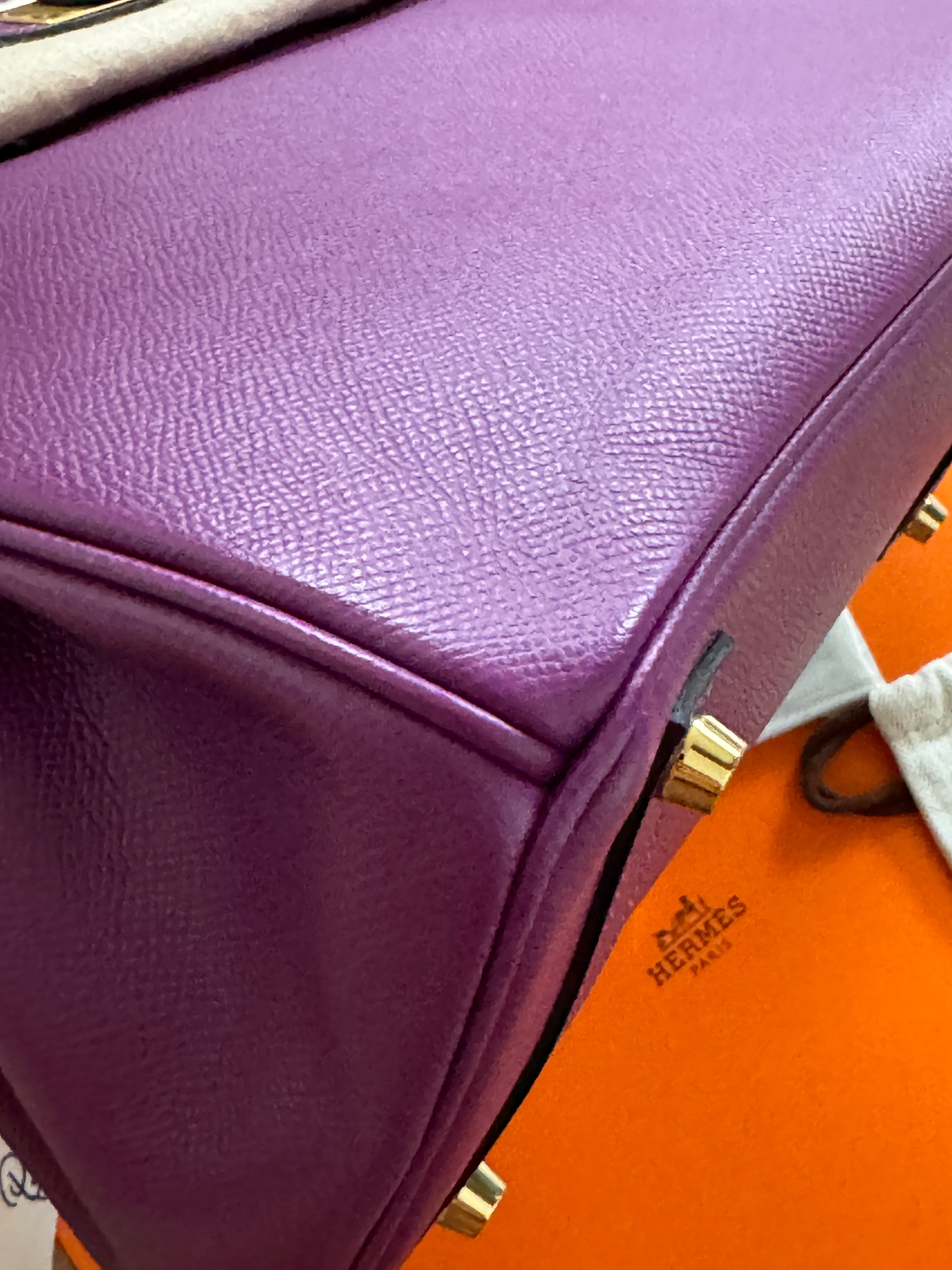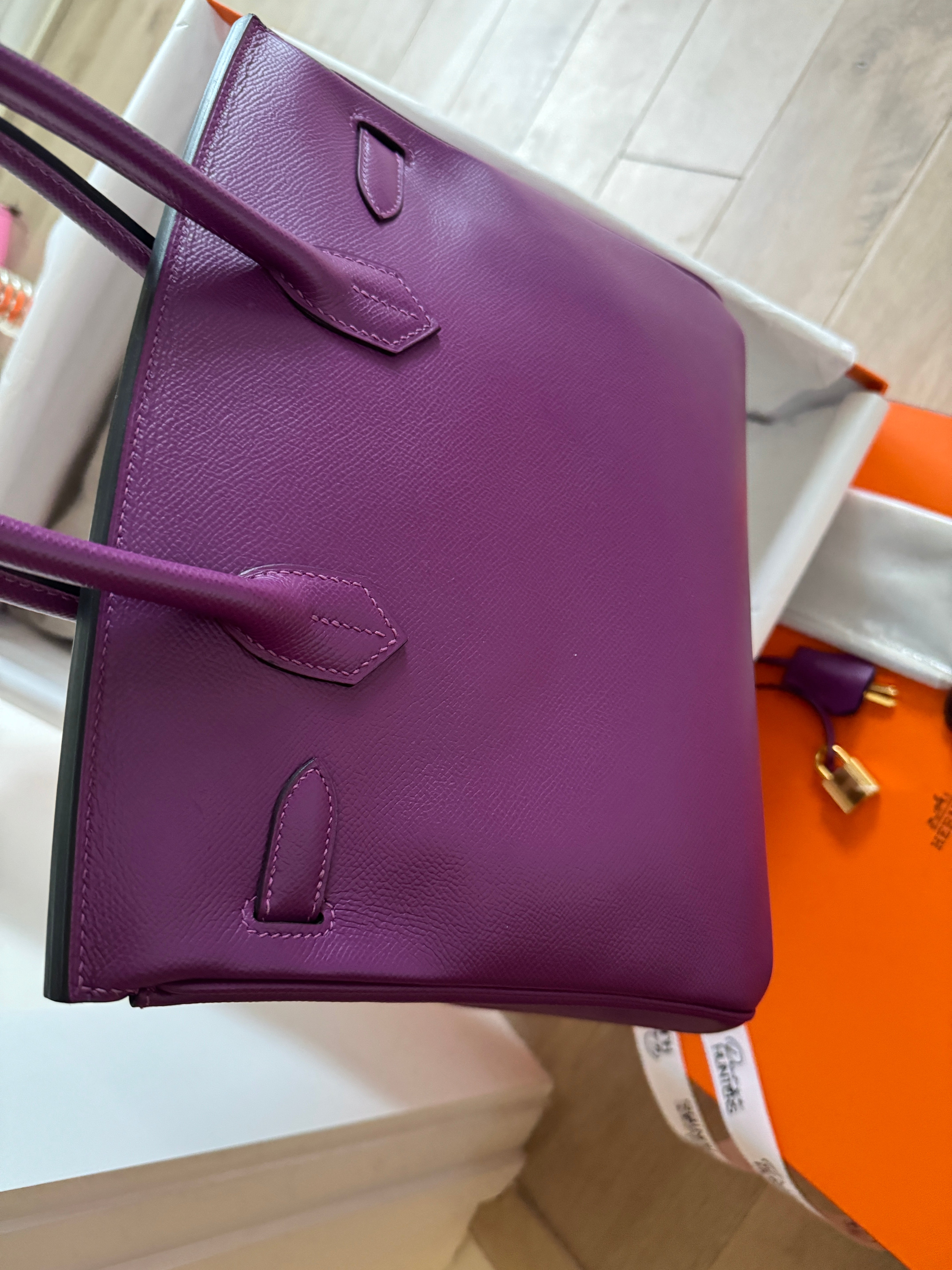 This ultra-chic classic handbag is crafted of luxurious epsom leather in beautiful purple Hermes Anemony color. The bag features thin but sturdy rolled leather top handles, a cross over flap with a strap closure, clasps with a gold plated turn lock with a matching padlock, and a hanging clochette with keys. The top opens to a spacious interior with zipper and patch pockets. Kept unused , flawless condition. With all plastics on hardware pieces, incl feet. This beautiful bag comes with dust bag, box, hardware set, rain coat, certificate of authenticity from Bababebi.