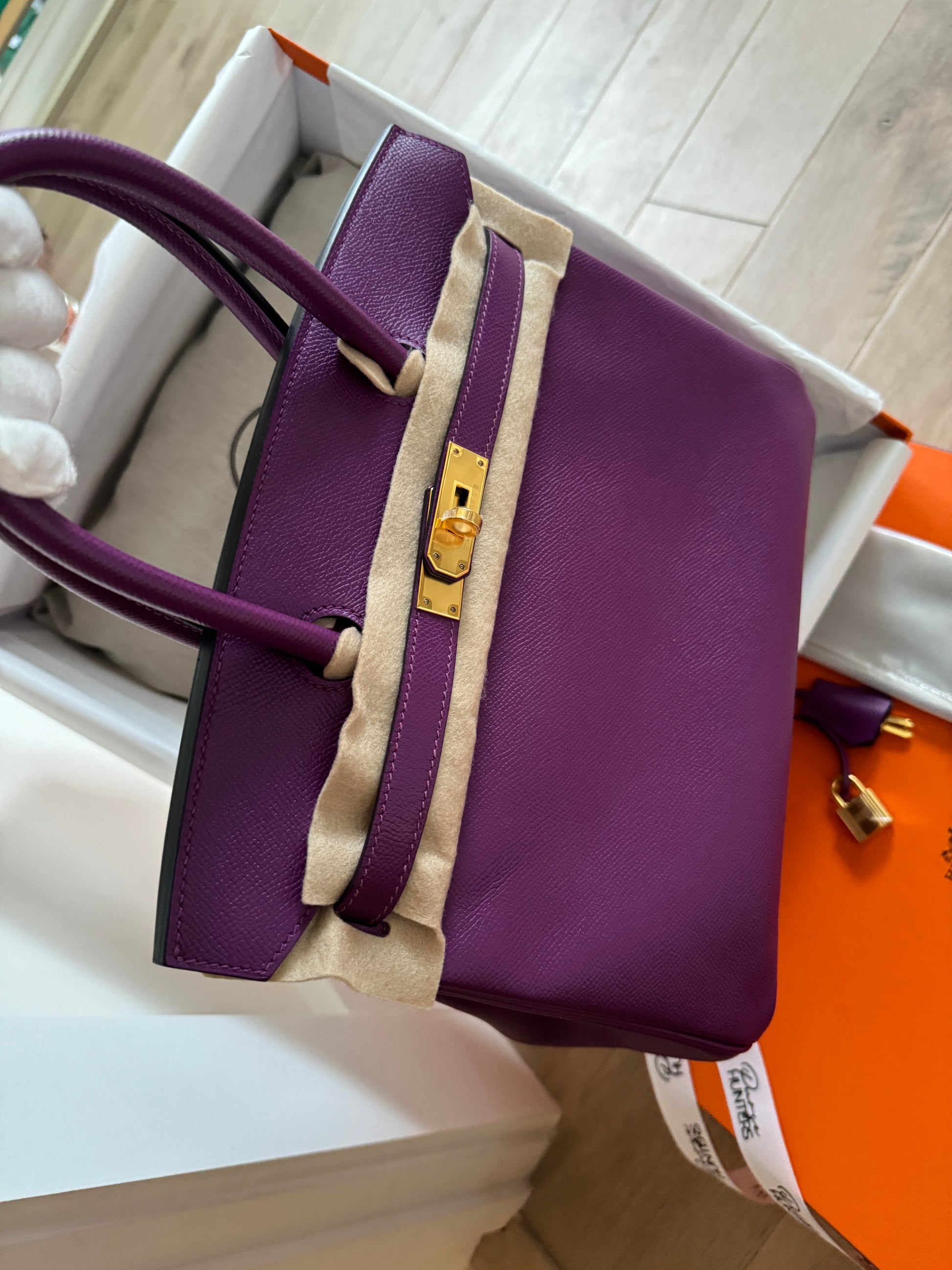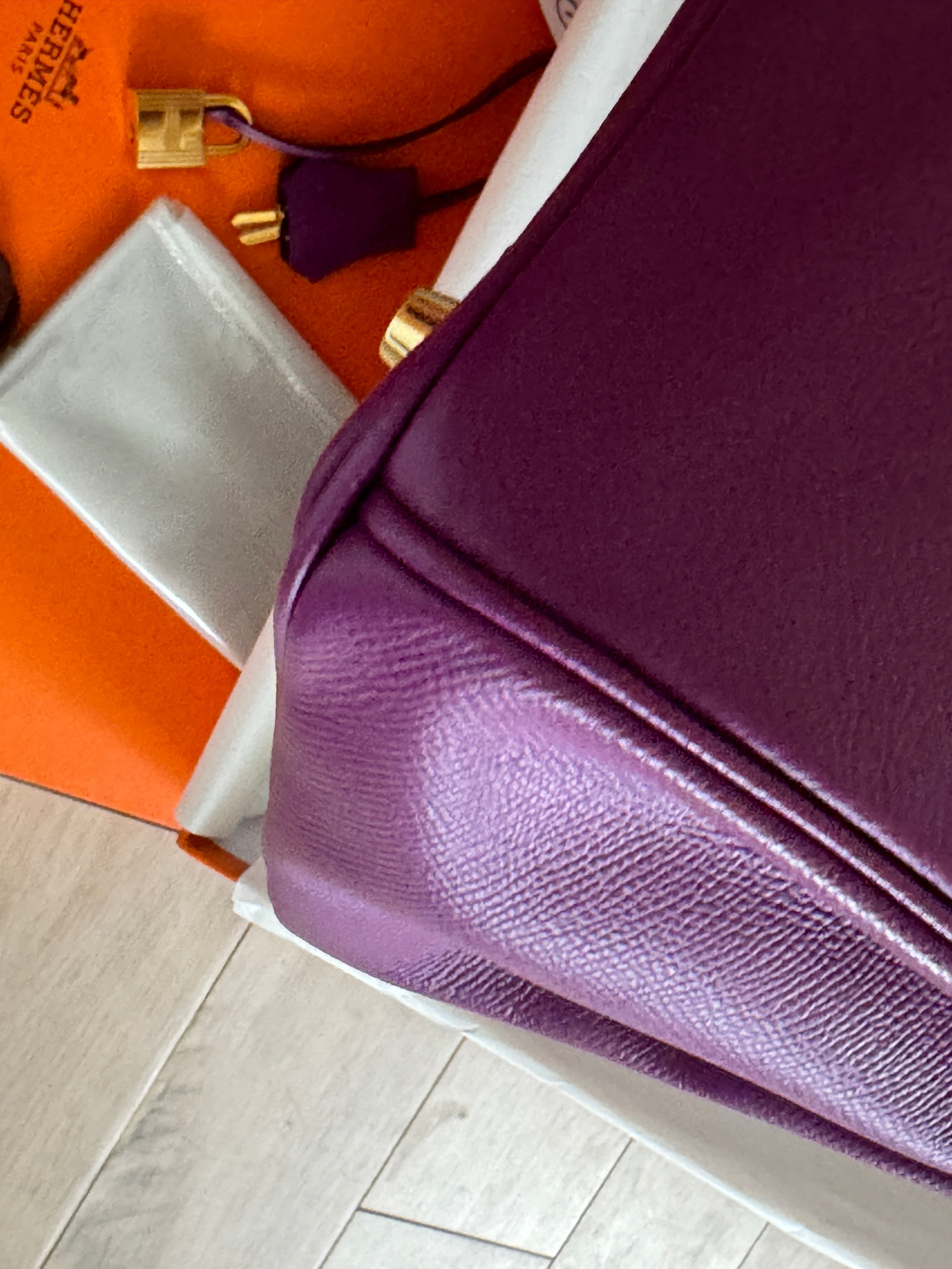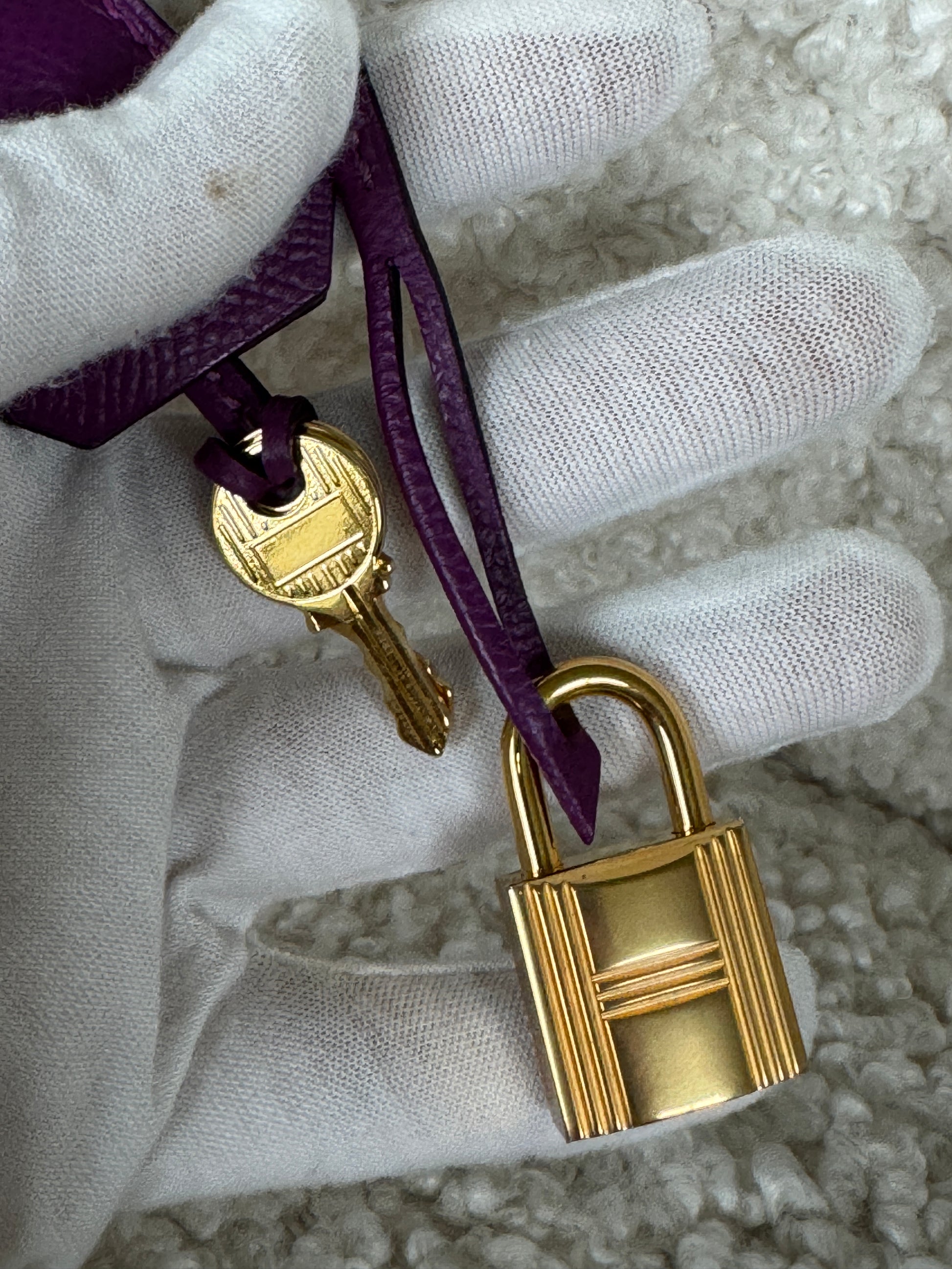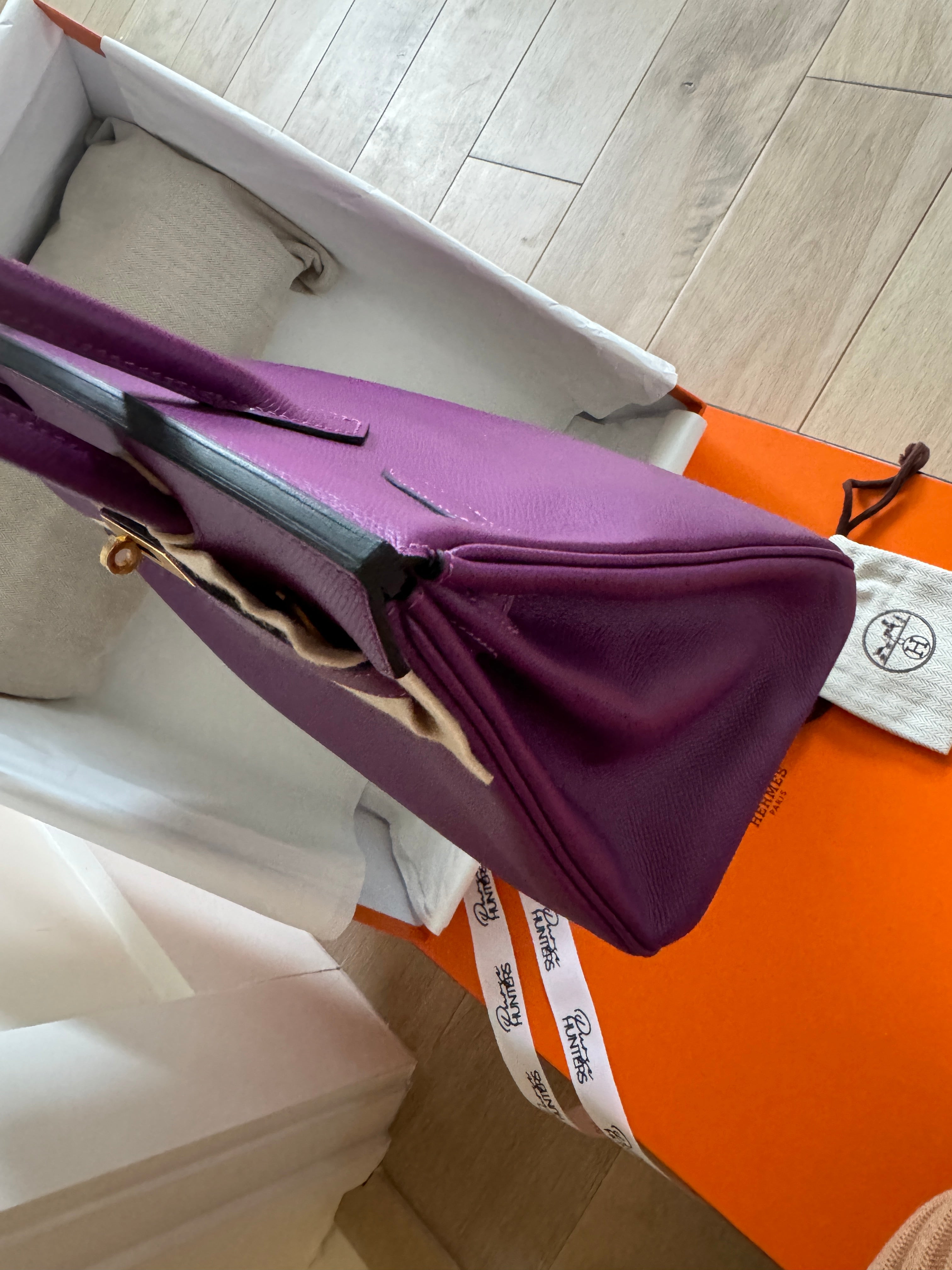 This ultra-chic classic handbag is crafted of luxurious epsom leather in beautiful purple Hermes Anemony color. The bag features thin but sturdy rolled leather top handles, a cross over flap with a strap closure, clasps with a gold plated turn lock with a matching padlock, and a hanging clochette with keys. The top opens to a spacious interior with zipper and patch pockets. Kept unused , flawless condition. With all plastics on hardware pieces, incl feet. This beautiful bag comes with dust bag, box, hardware set, rain coat, certificate of authenticity from Bababebi.