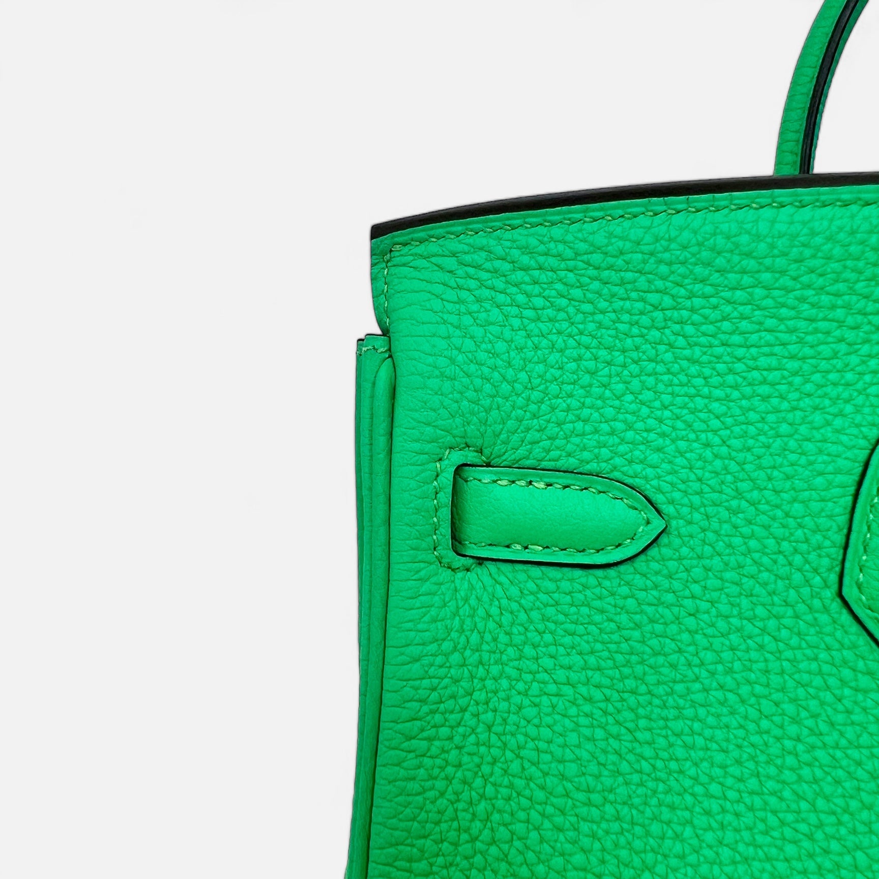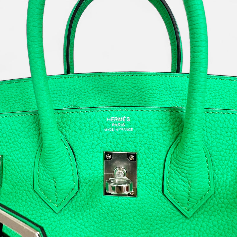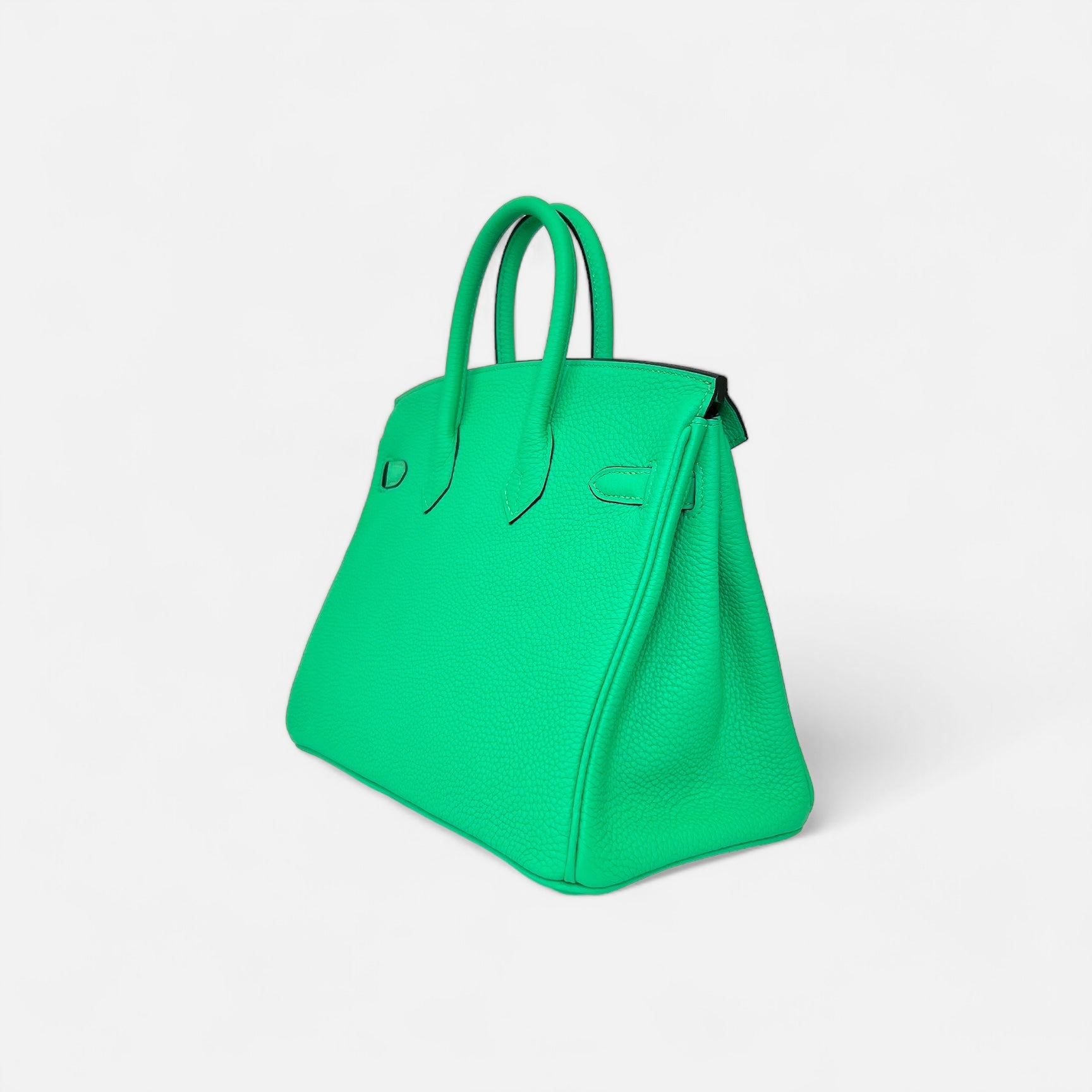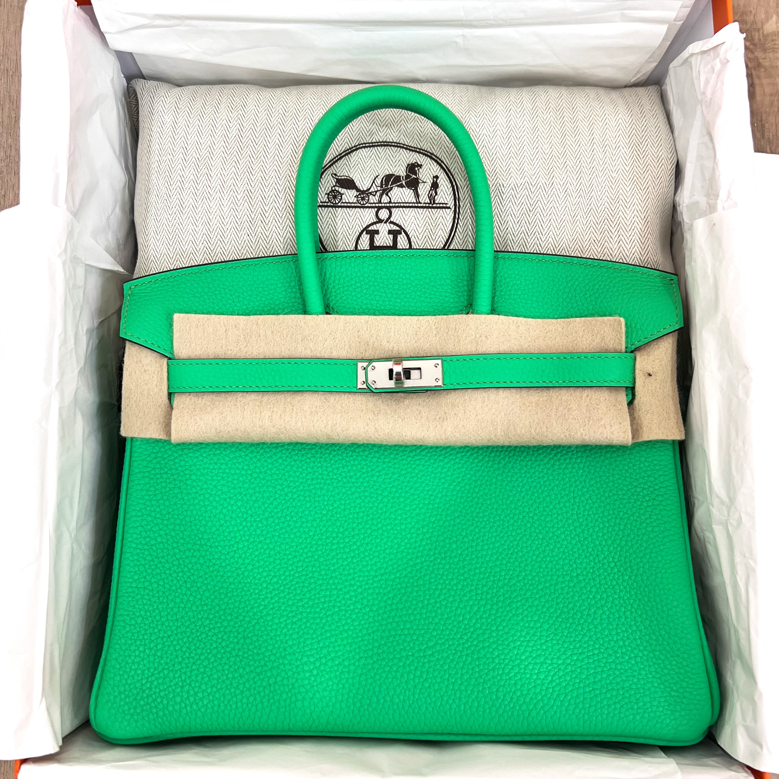Hermès Vert Comics Togo Birkin 25 Palladium Hardware. The interior is lined in a tonal chèvre leather. Front flap with two straps, front Toggle closure, clochette with lock and two keys, and double rolled handles. The interior is lined with Vert Comics chevre and has one zip pocket with an Hermes engraved pull and one open pocket on the opposite side. Stamp B. Year 2023.