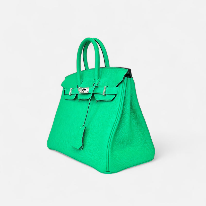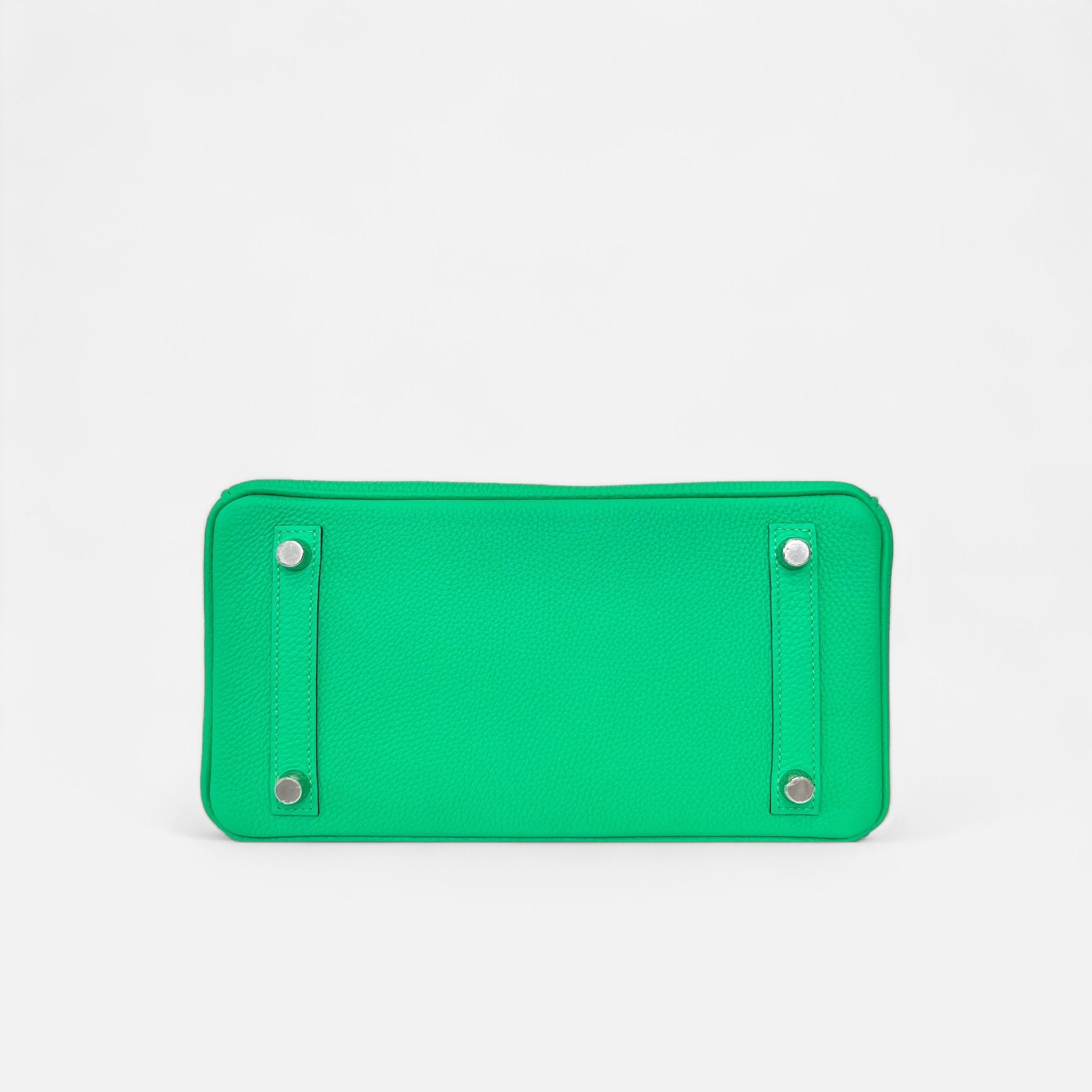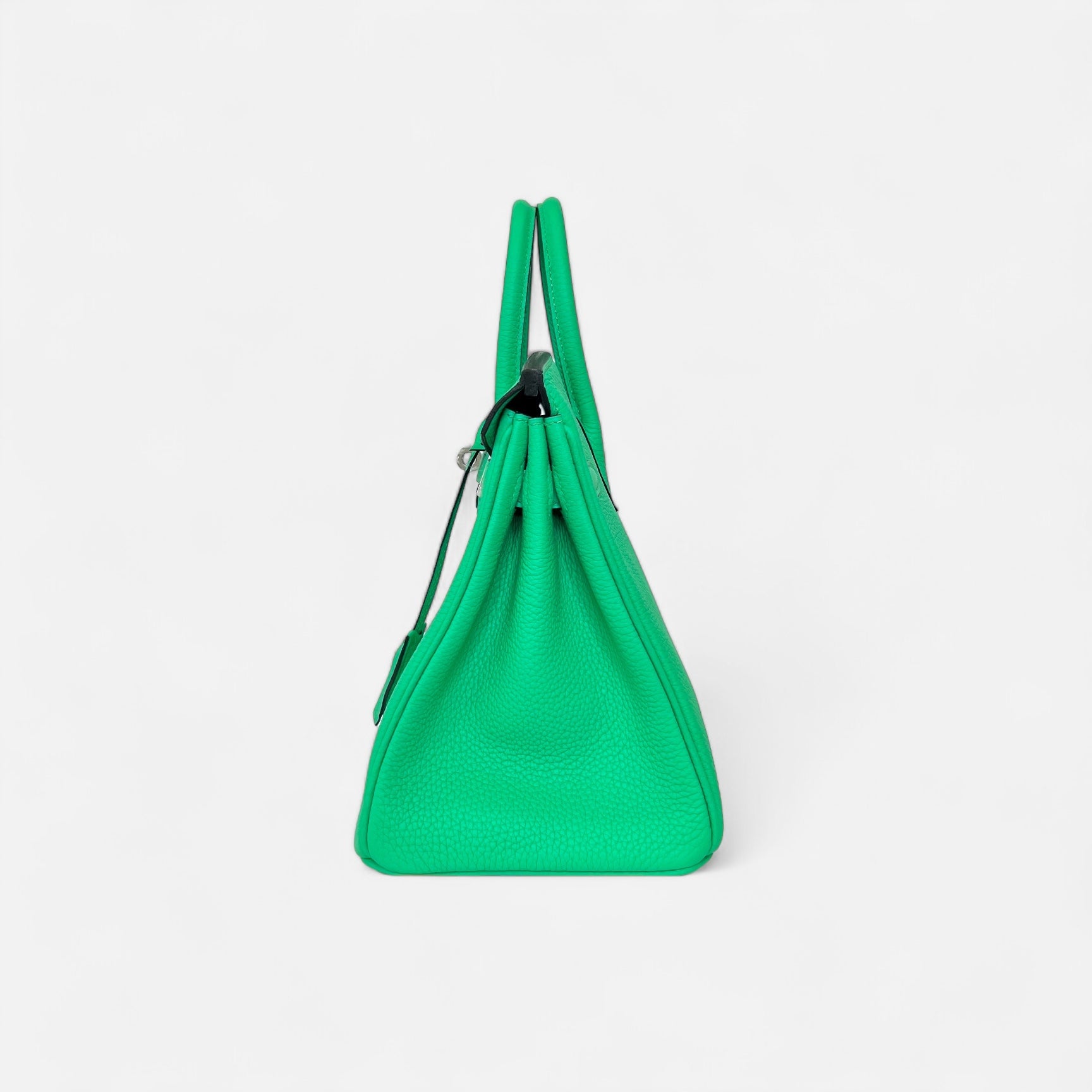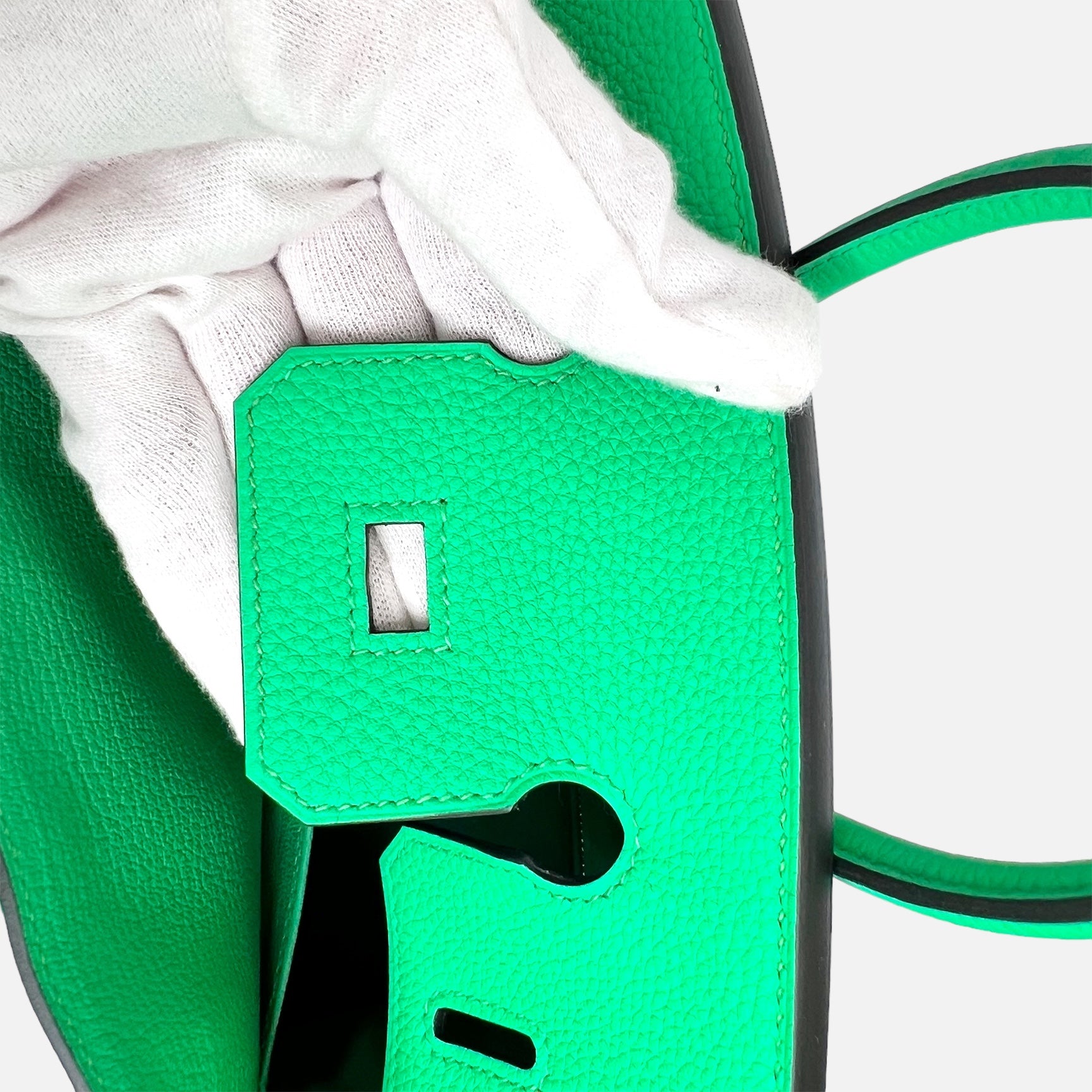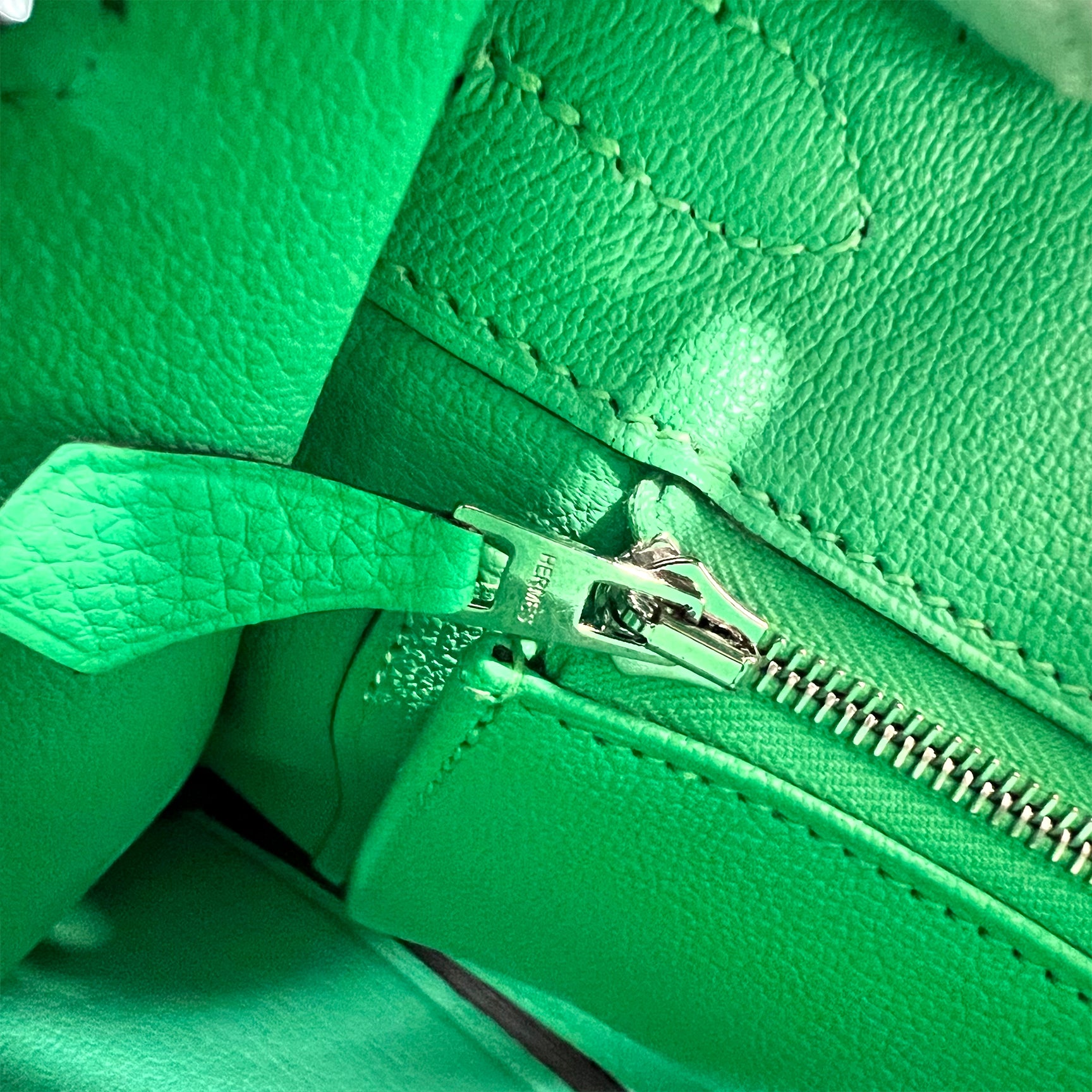 Hermès Vert Comics Togo Birkin 25 Palladium Hardware. The interior is lined in a tonal chèvre leather. Front flap with two straps, front Toggle closure, clochette with lock and two keys, and double rolled handles. The interior is lined with Vert Comics chevre and has one zip pocket with an Hermes engraved pull and one open pocket on the opposite side. Stamp B. Year 2023.