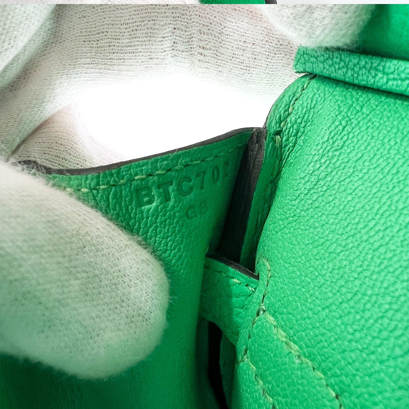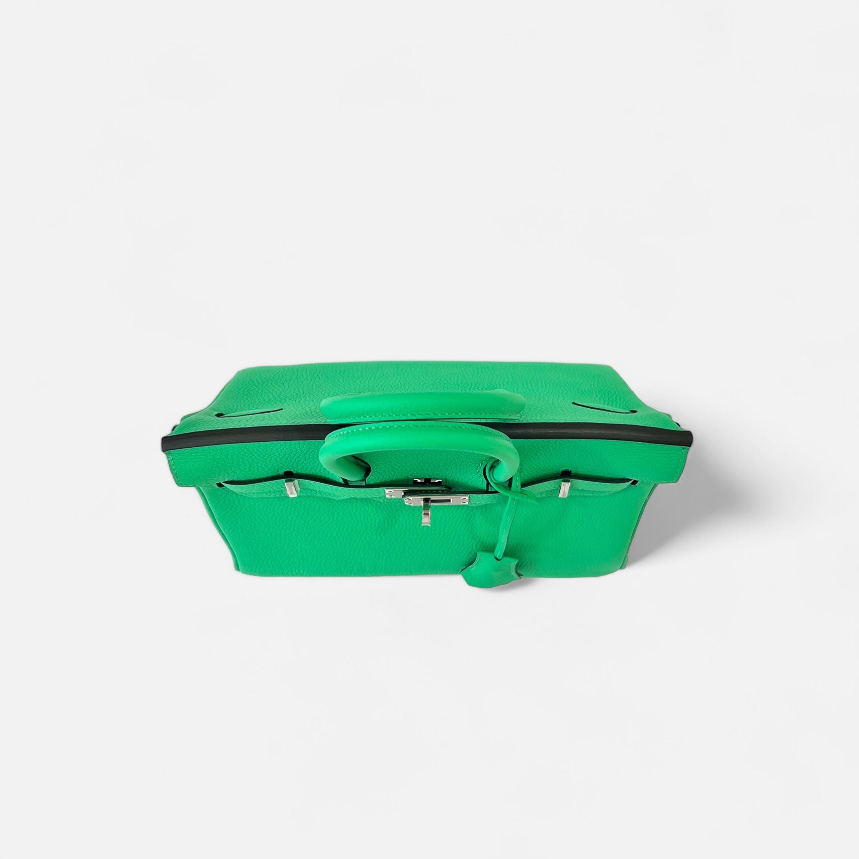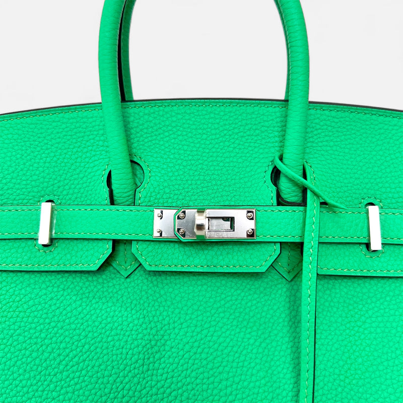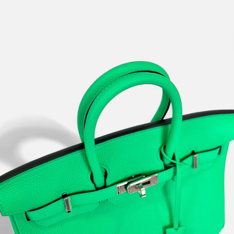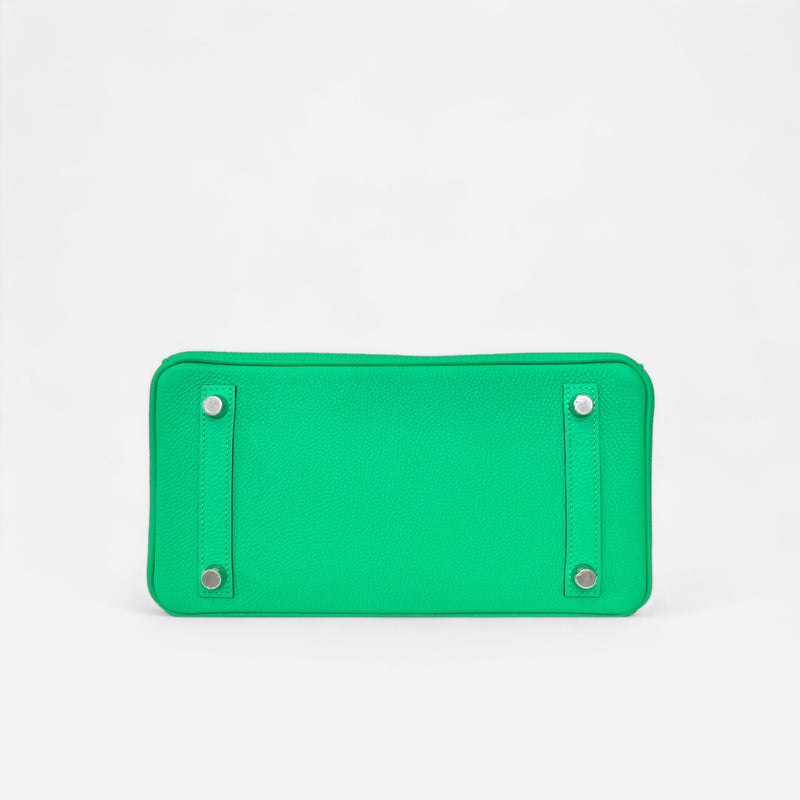 Hermès Vert Comics Togo Birkin 25 Palladium Hardware. The interior is lined in a tonal chèvre leather. Front flap with two straps, front Toggle closure, clochette with lock and two keys, and double rolled handles. The interior is lined with Vert Comics chevre and has one zip pocket with an Hermes engraved pull and one open pocket on the opposite side. Stamp B. Year 2023.