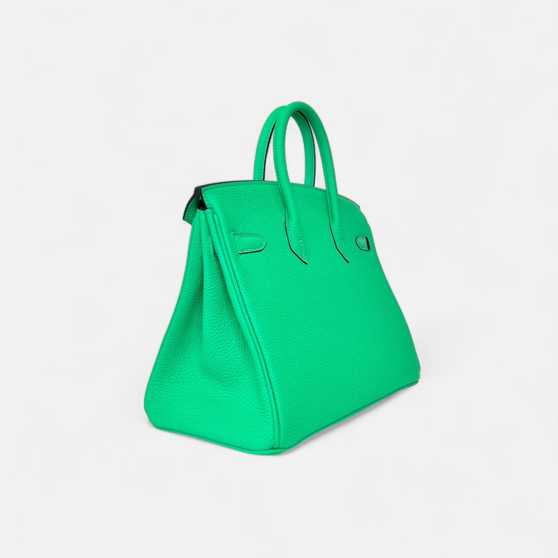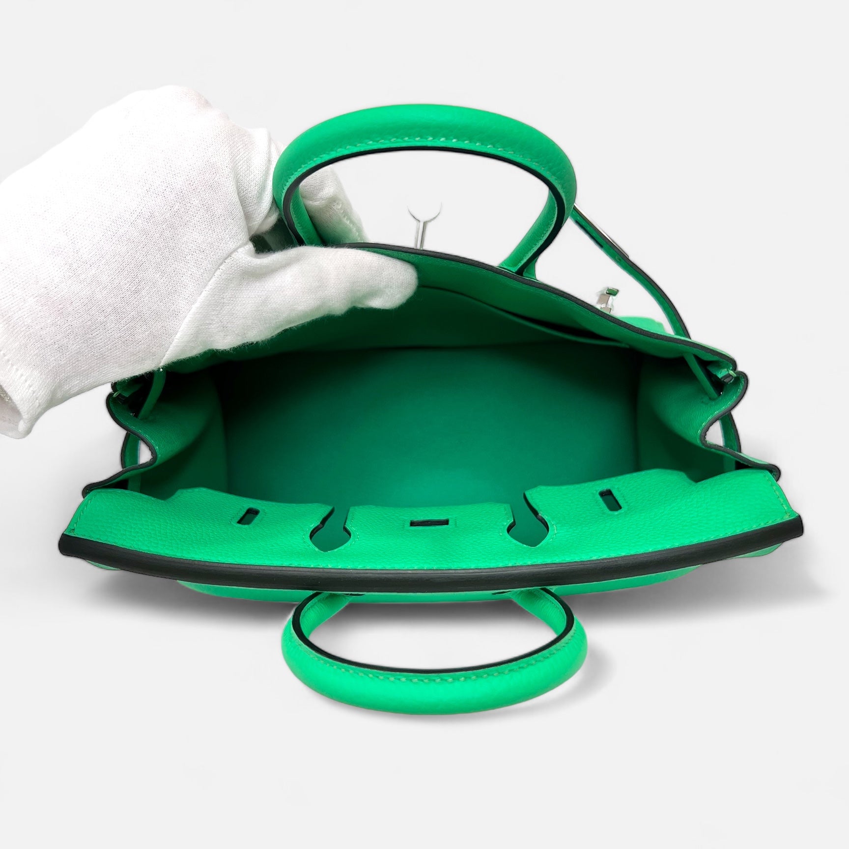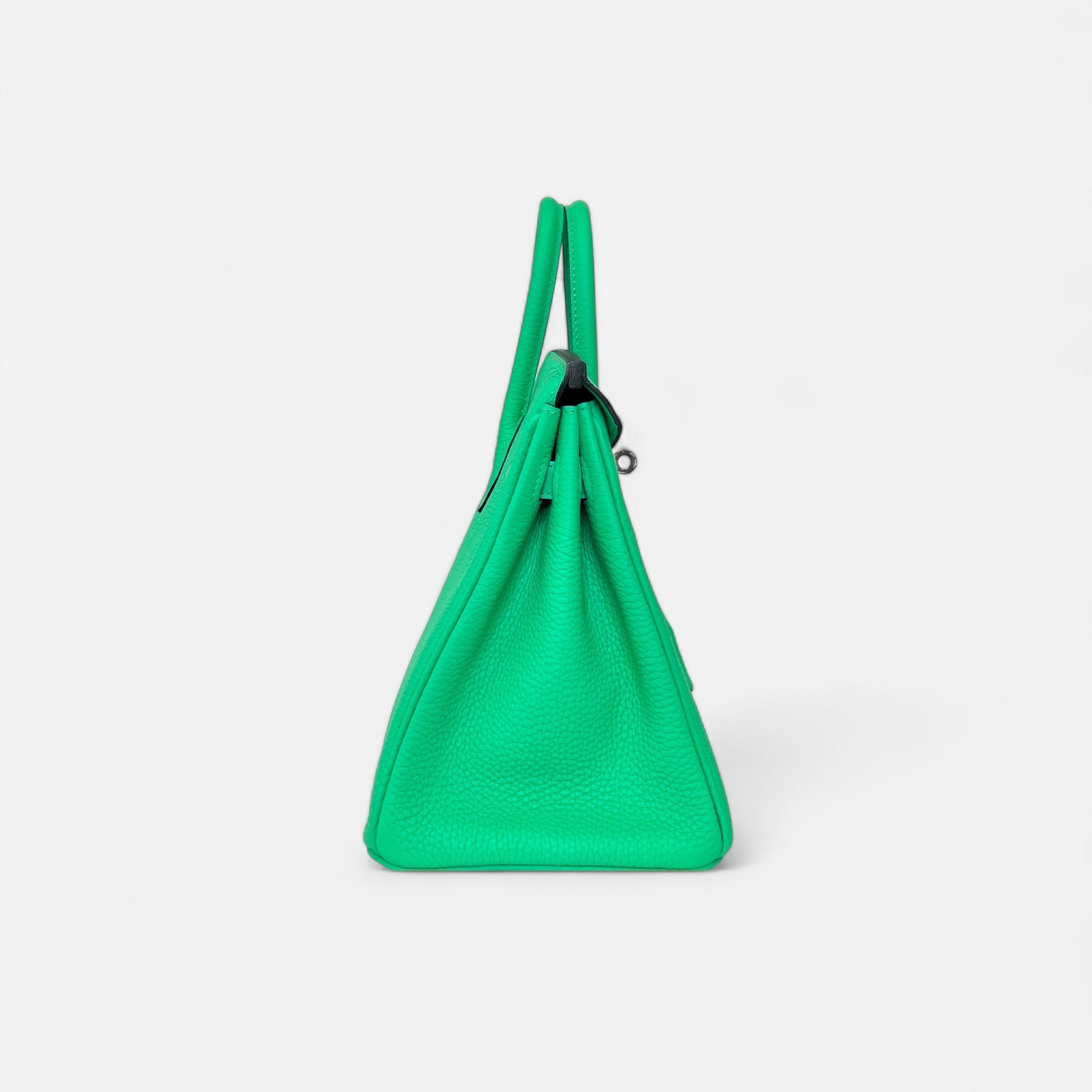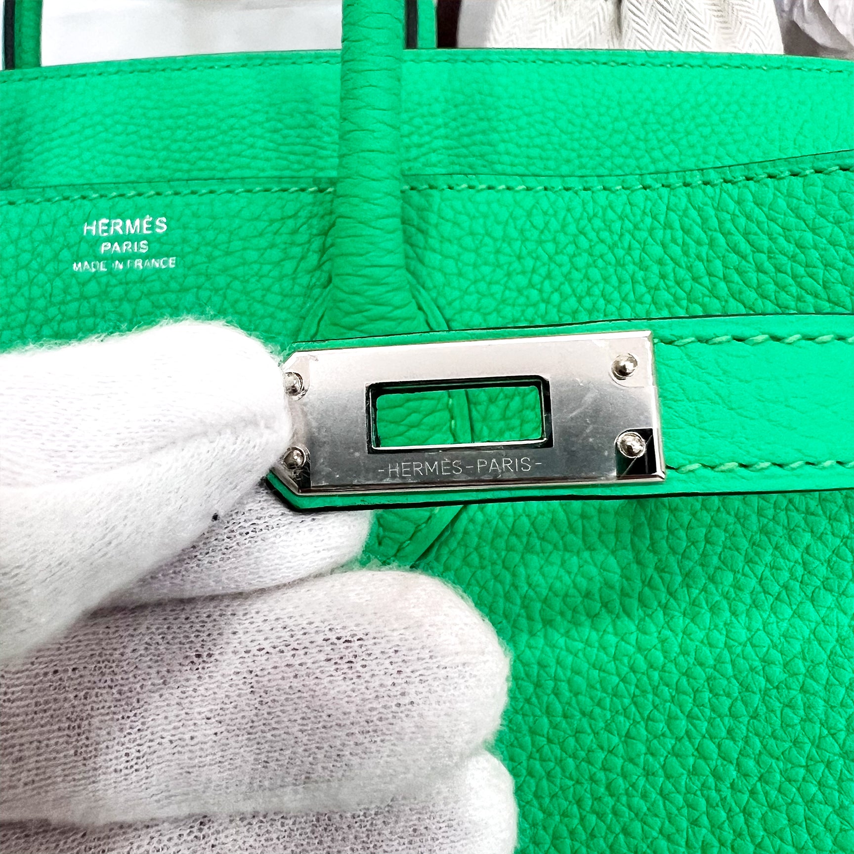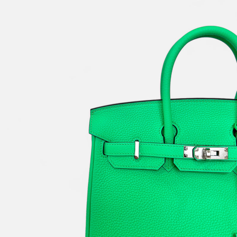 Hermès Vert Comics Togo Birkin 25 Palladium Hardware. The interior is lined in a tonal chèvre leather. Front flap with two straps, front Toggle closure, clochette with lock and two keys, and double rolled handles. The interior is lined with Vert Comics chevre and has one zip pocket with an Hermes engraved pull and one open pocket on the opposite side. Stamp B. Year 2023.