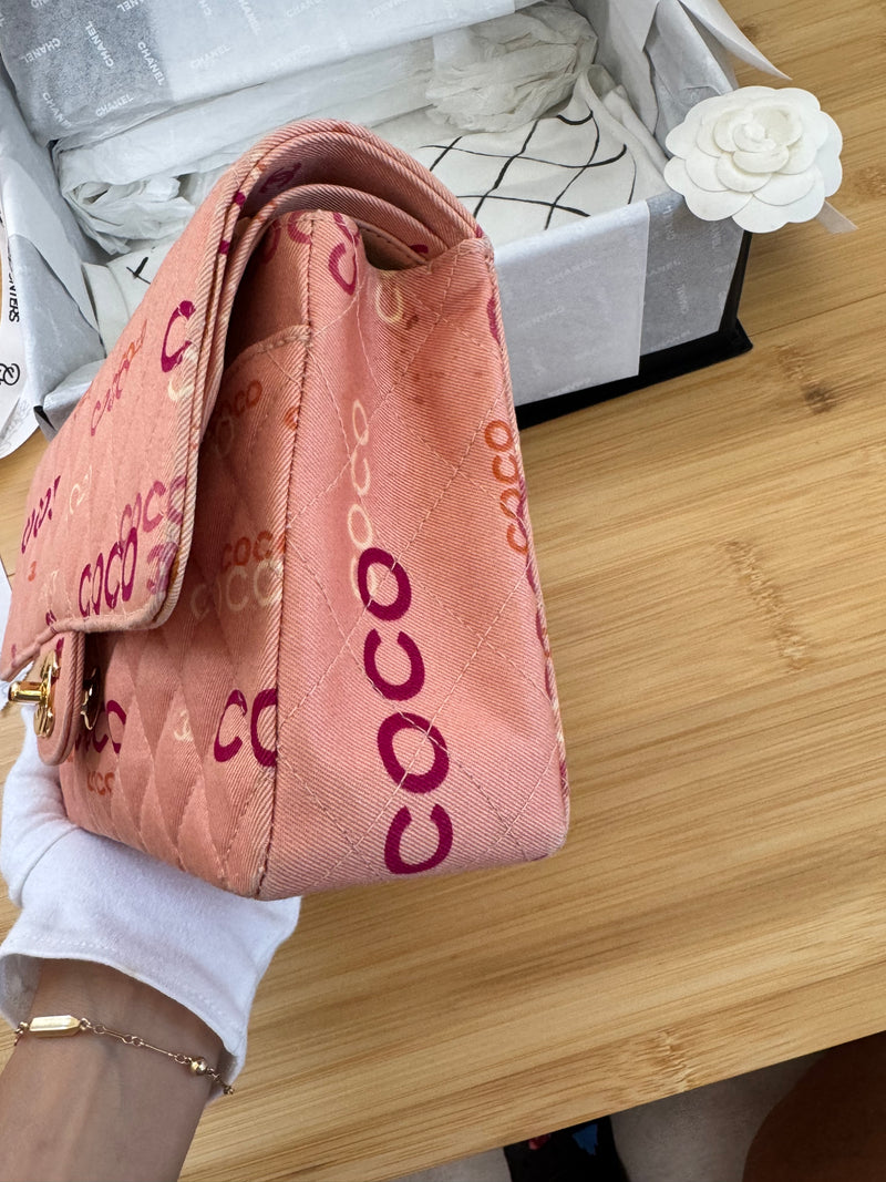 This is an authentic pre-owned Chanel Classic Flap in blush-pink quilted canvas, playfully printed with multicolor “COCO” and CC logos throughout. The bag is finished with gold-tone hardware, including the signature CC turn-lock closure and the iconic leather-threaded chain shoulder strap.